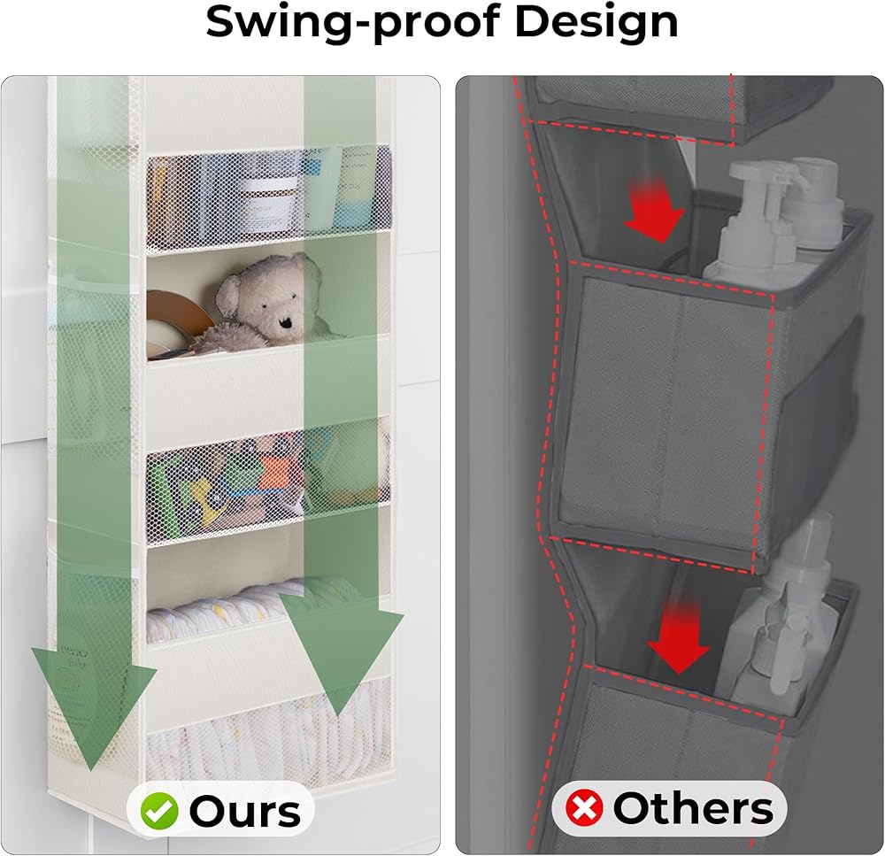 Swing-proof & Sturdy - The stitched design between the side pocket makes the whole product no more tilt. The top of the hanging cabinet behind the door is an MDF board, which allows it to maintain its shape well so that it will not deform or tilt when bearing heavy objects.