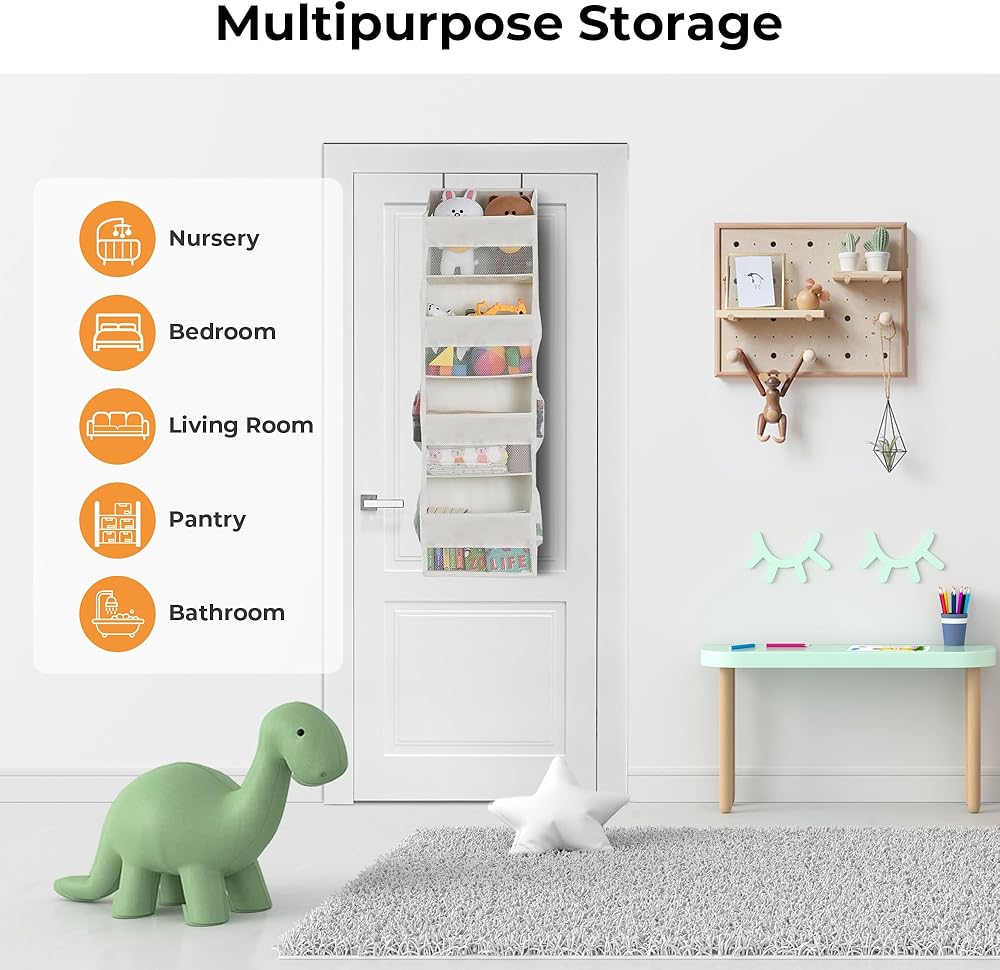 Multi-Function - This door pocket is suitable for children's rooms, storage rooms, offices, laundry rooms, bedrooms, bathrooms, dormitories, etc. toys, diapers, wet wipes, baby towels, socks, etc. It is suitable for a child's room behind the door or bedroom to store cosmetics, hair dryers, kettles, and curling irons.