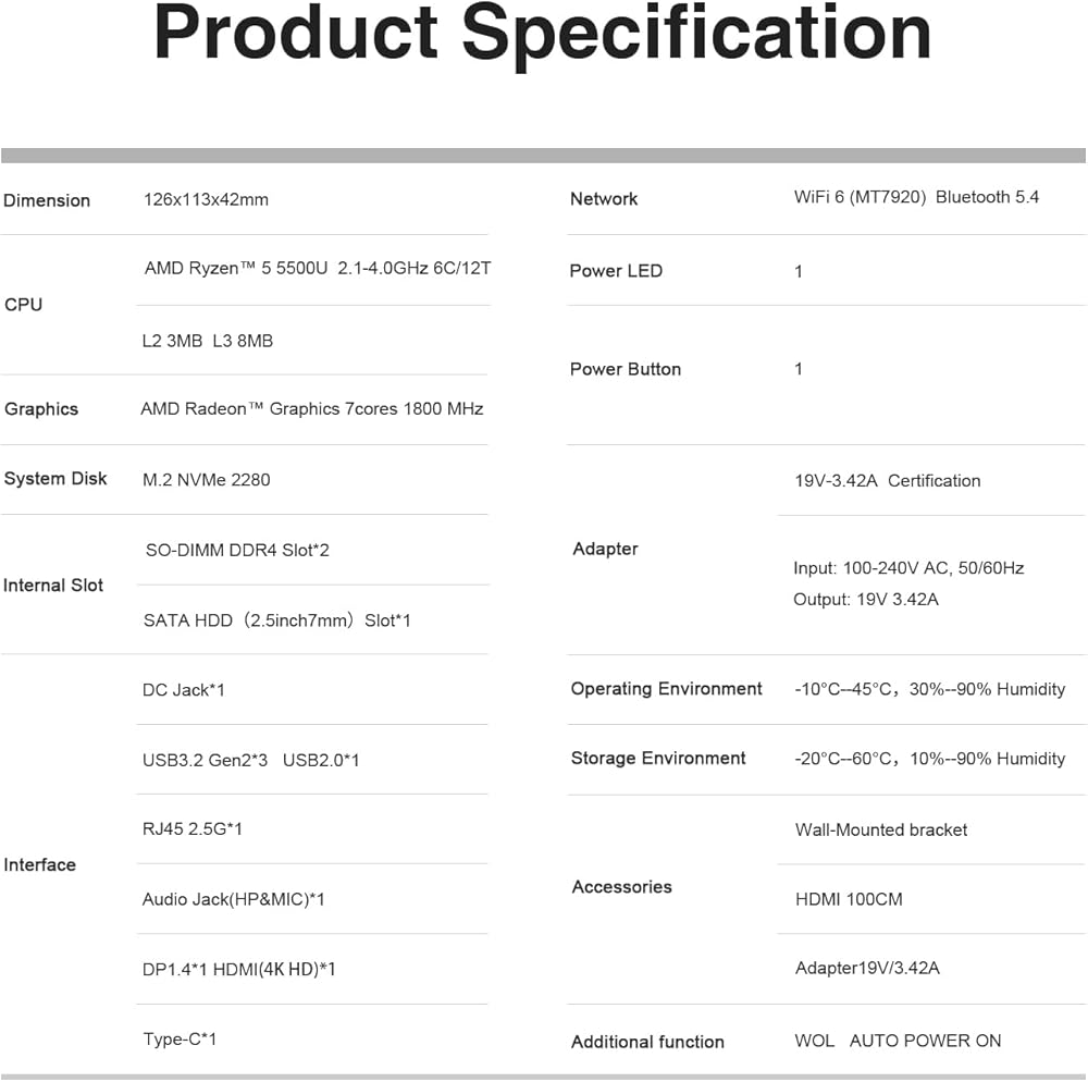✅Package List + Reliable Service: Package List(1* 5500U micro computer, Wall-Mounted bracket,HDMI 100CM&20CM,Adapter19V/3A,Interfaces: DC Jack*1, USB3.2 Gen2*3 USB2.0*1, 2.5G LAN*1, Audio Jack(HP&MIC)*1,HDM*1, Type-C*1.If you have any questions about our desktop computer, please don't hesitate to con--tact us. We will provide you with one-year warr--anty, 7*24-hour one-on-one customer support, and lifetime technical support.
