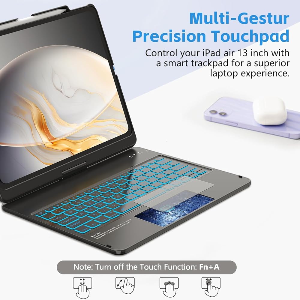 360° Rotatable Touch Keyboard Case for iPad Air 13 inch: This Touchpad for iPad air 13 inch case keyboard support 360° Rotatable. Compatible with iPad Air 13 inch M3 2025 (Model Number: A3268 A3269 A3271) and for iPad Air 13 inch M2 2024 (Model Number: A2900 A2899 A2898) and for iPad Pro 12.9 inch 6th Generation (Model Number: A2436 A2437 A2764 A2766) and for iPad Pro 12.9 inch 5th Generation (Model Number: A2378 A2379 A2461 A2462) and for iPad Pro 12.9 inch 4th 3rd Generation (Model Number: A1876 A1983 A1895 A2014 A2229 A2069 A2232 A2233); Please be kindly check your tablet back model before purchasing