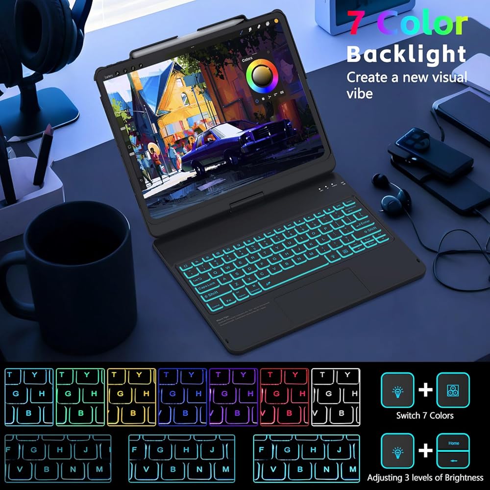 7 Colors Backlit Keyboard for iPad Air 13 inch: A full row of like laptop shortcuts and adjustable 3-level, 7-color RGB LED backlighting make typing easy and comfortable in any dimly lit environment
