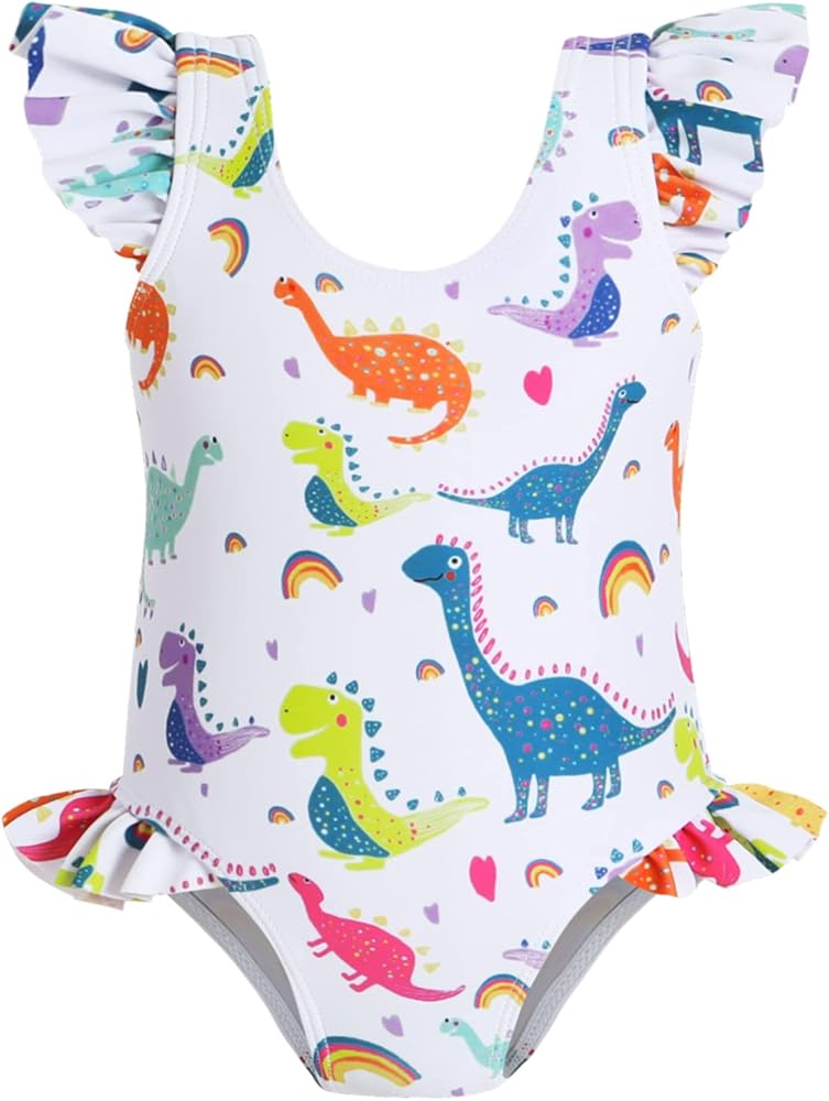 Adorable Design: Baby girl one piece swimsuit designs beautiful ruffles, different cute dinosaur prints, fashionable and eye-catching. Proper coverage toddler bathing suit allows your girl to enjoy in summer.