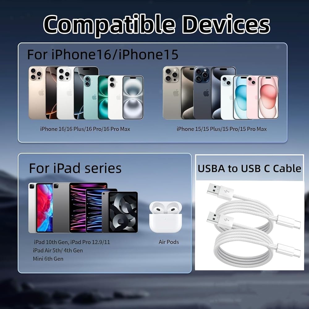 【Universal Compatibility】 This usb c cable is compatible for iPhone 16/iPhone 16 Plus/iPhone 16 Pro/iPhone 16 Pro Max/iPhone15/iPhone15 pro max/iPhone15 mini/iPhone15 Plus/iPhone14/iPhone14 pro/iPhone14 pro max/iPhone14 max/iPhone 13/ 13 Mini/ 13 Pro/ 13 Pro Max/ iPhone 12/ 12 Mini/ 12 Pro/ 12 Pro Max/ SE 2020/ iPhone 11/ 11 Pro/ 11 Pro Max/MacBook Pro, Macbook Air 13, MacBook 12 inch,MacBook series. iPad Pro/ iPad Air/iPad Mini,iPad series. GalaxyS23+/S23/S22+/S22,and more USB-C port devices.