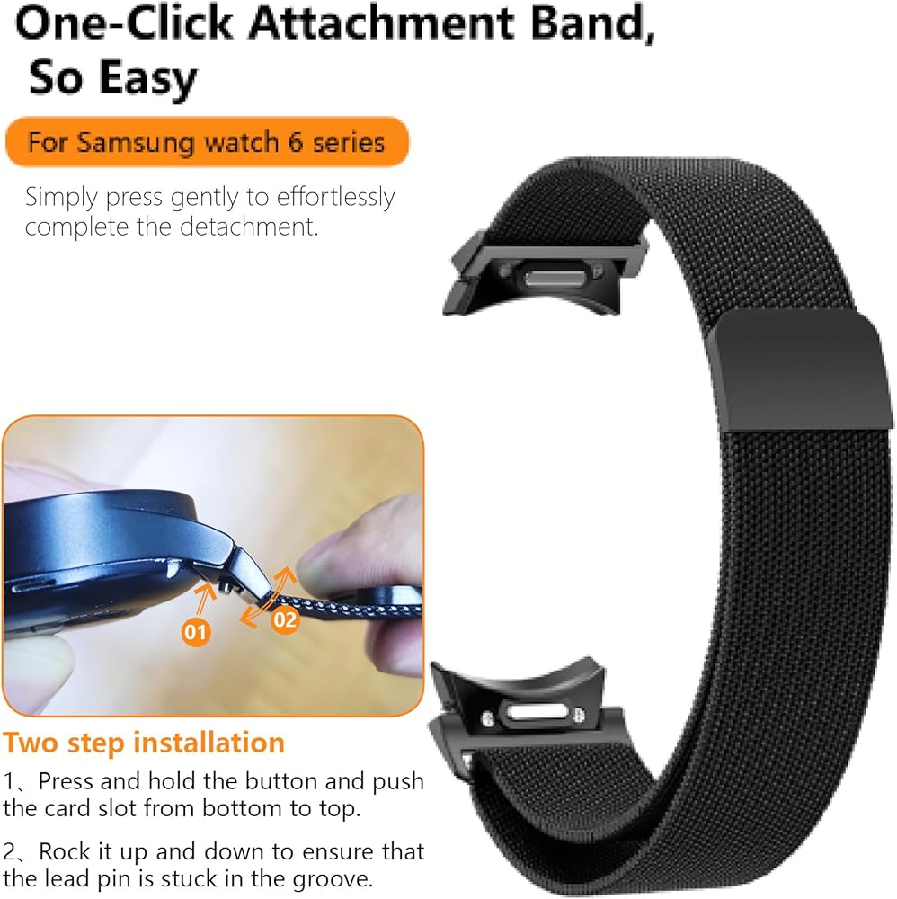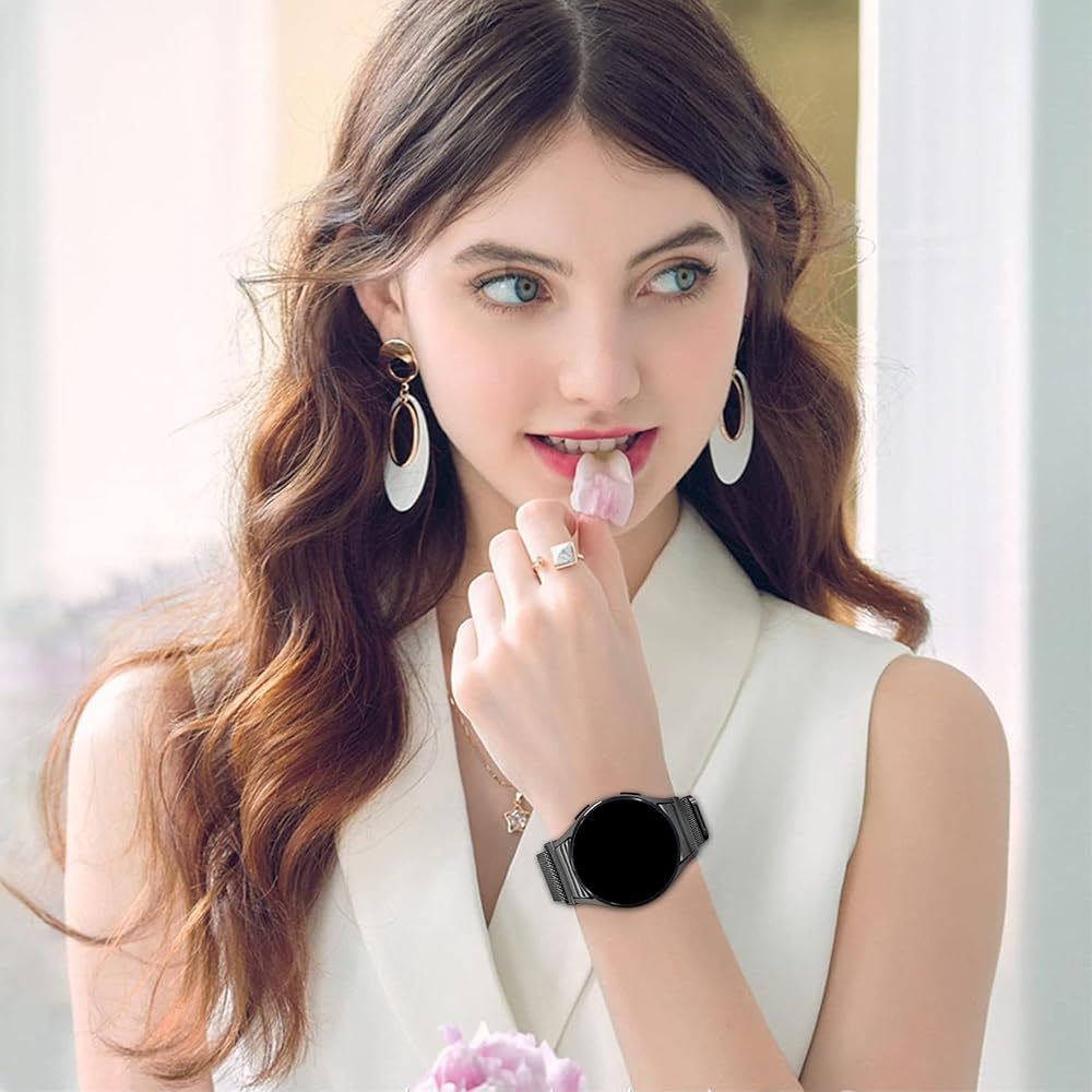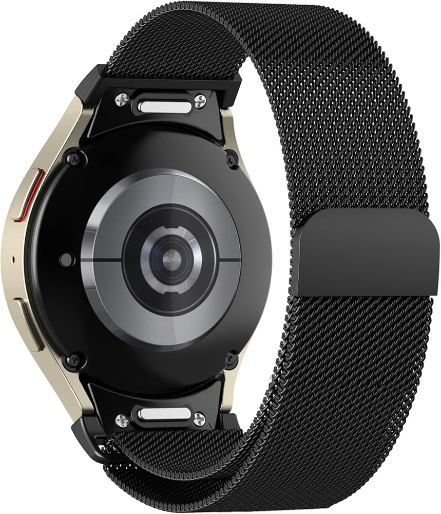 One Click No Gap Milanese Bands for Samsung Galaxy Watch 7 6 5 4 FE Band 40mm 44mm/Galaxy Watch 6 Classic Band 47mm 43mm/Watch 4 Classic 42mm 46mm/5 Pro 45mm,T-Buckle Closure Magnetic Metal strap Women Men Premium Material Samsung galaxy Watch band, is made of high quality mesh stainless steel metal with a unique magnetic lock and polished edge, metal wristband has no corrosion, rust. Magnetic connector and mesh loop design makes your strap more flexible to adjust the length. Upgraded Design Milanese Loop bands for galaxy watch The connector adopts Samsung's official push-type seamless design, and the material is made of stainless steel, which is consistent with the texture of the strap chain. It fits seamlessly with your Samsung watch, making it easier to install and disassemble. It is beautiful, exquisite, classy and stylish. Wide-Compatible with samsung Watch / galaxy Watch 20mm No gap Milanese loop band is only designed for Samsung Galaxy Watch 7 40mm 44mm, Samsung Galaxy Watch FE 40mm 44mm,Samsung Galaxy Watch 6 40mm 44mm,Samsung Galaxy Watch 6 Classic 43mm 47mm, Samsung Galaxy Watch 5 40mm 44mm, Samsung Galaxy Watch 5 Pro 45mm, Samsung Galaxy Watch 4 40mm 44mm, Samsung Galaxy Watch 4 Classic 42mm 46mm. Stainless steel metal watch band for galaxy watch band fits 5.9”-9.4” (150mm-240mm) wrists. 1 pack galaxy Watch Magnetic Metal bands have 7 stylish options offered. A:Black,Silver,Pink,Rose gold,Starlight,Colorful,Gold Package included Watch band*1(No Watch included )