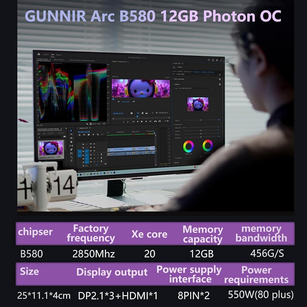 Unlock next-gen performance with the GUNNIR Intel Arc B580 GPU. Engineered for gamers and creators, this 12GB GDDR6 graphics card delivers 2670 MHz clock speeds and PCIe 4.0 x16 bandwidth for buttery-smooth 4K gaming, 3D rendering, and AI-driven content creation.