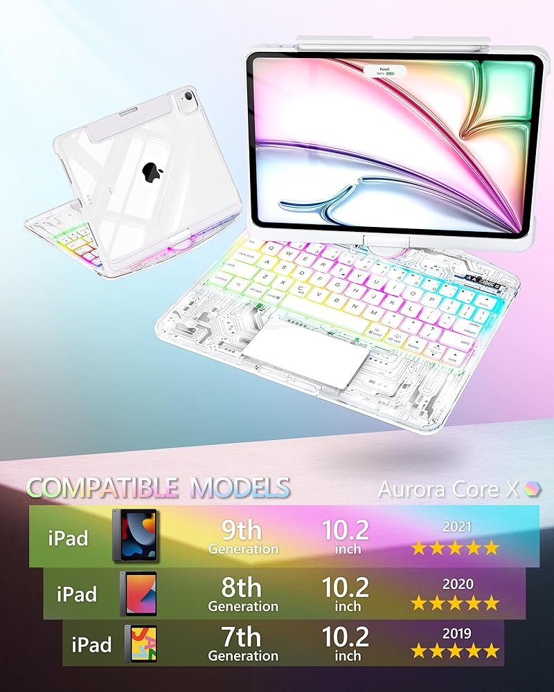 Keyboard Case for iPad 9th 10.2 inch, 360° Rotating Multi-Touch Trackpad, 7-Color Backlit Keyboard, Compatible with iPad 9th(10.2inch,2021) iPad Air,Arctic Core X