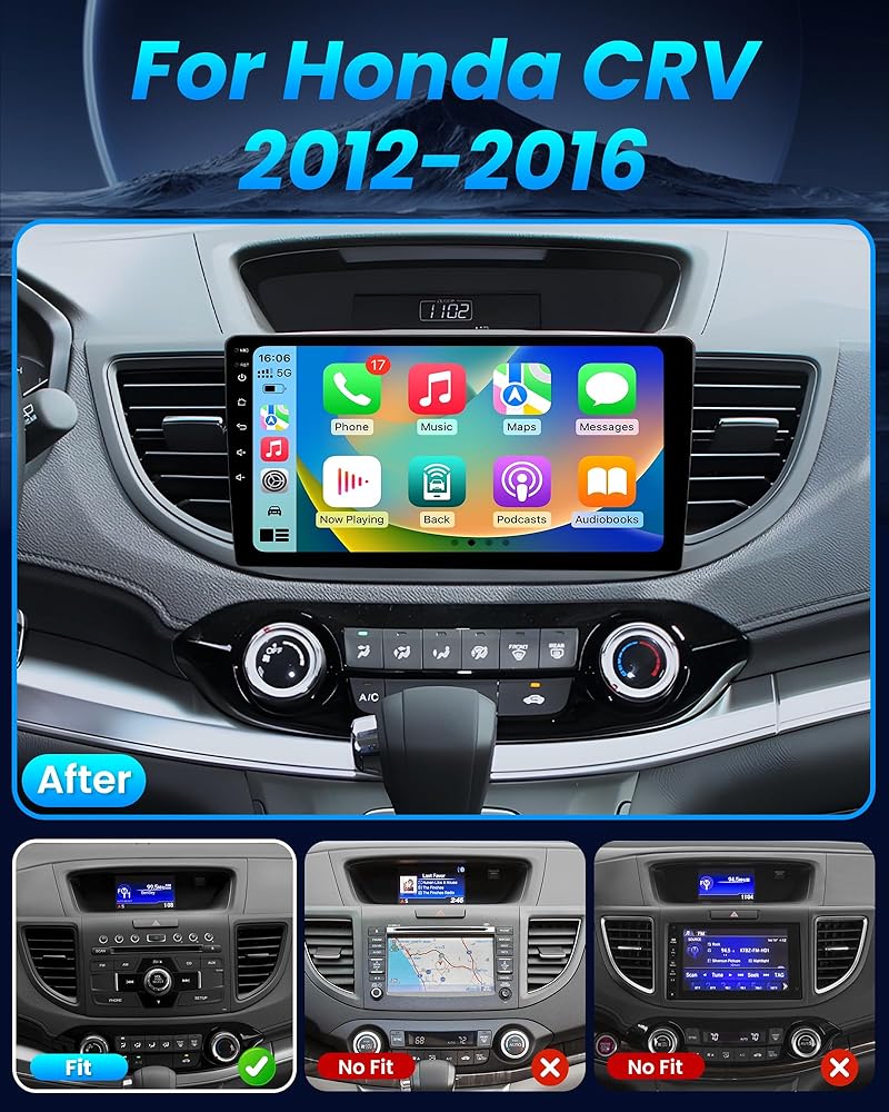 8core 4G 32G for Honda CRV Radio : Upgraded Android system,10 inch 2.5D 1280P HD IPS touch screen,4G RAM 32G ROM,offline/online GPS navigation,Wifi connection,DSP/RDS/FM radio,two USB,36 EQ adjustable,built-in Hi-Fi audio,with HD rear view camera,steering wheel control.This car stereo is perfectly suitable for Honda CRV 2012 2013 2014 2015 2016 stereo radio,and no need to purchase additional accessories.If you are not sure if it can be installed, please let us know.honda crv 2012 carplay.
