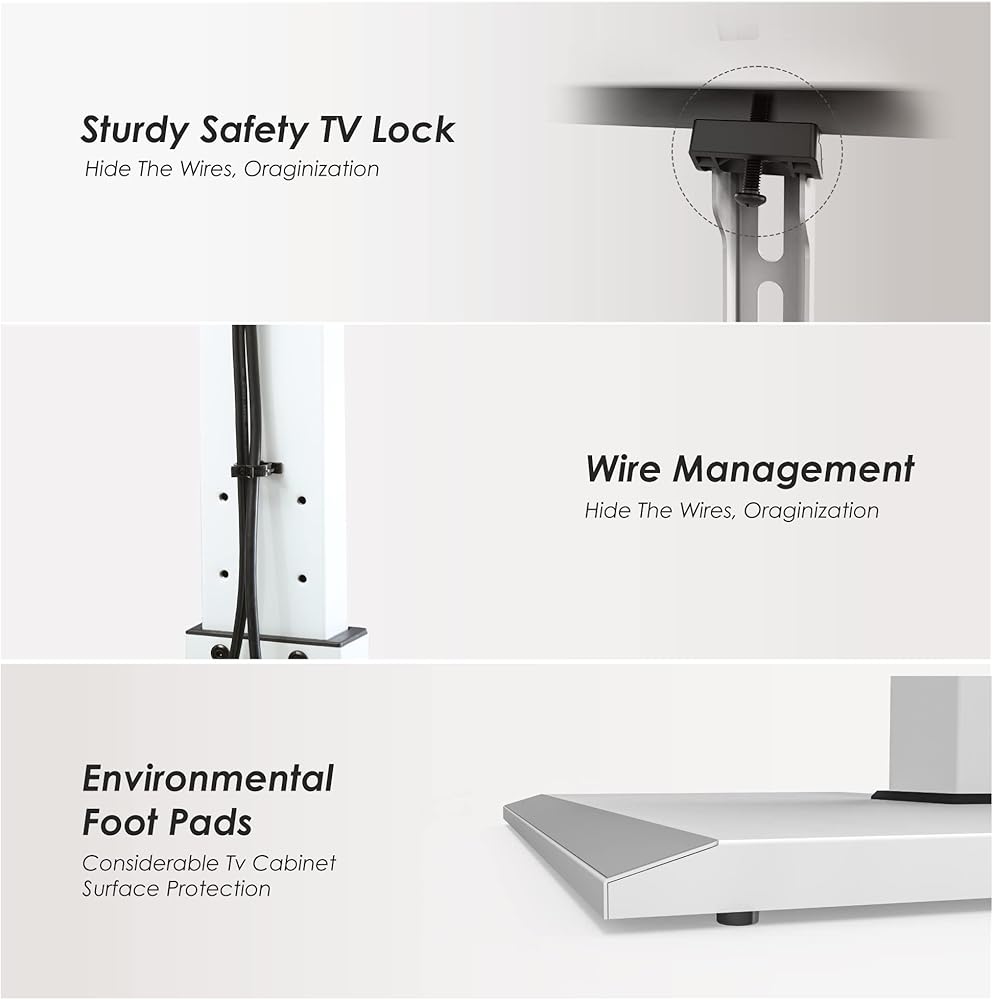 Cable Management & Safety Lock: The Universal Swivel TV Stand has a specially designed channel in the column, this white tall tv stand can collect messy cables. Our portable tv stand come with “Safety Lock”, it will protect your TV from dropping off
