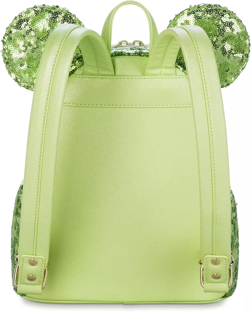 Friends will go green with envy when you're carrying this Tinker Bell inspired mini backpack by LF. Dazzling in lime green sequins and outfitted with adjustable straps, a velvety bow and Minnie ears, it's a sparkling, pixie-dusted look that will have hearts soaring on any hike or happy outing. Approx. 11'' H (12 1/2'' H including ears) x 9'' W x 5'' D (6'' D including pouch)