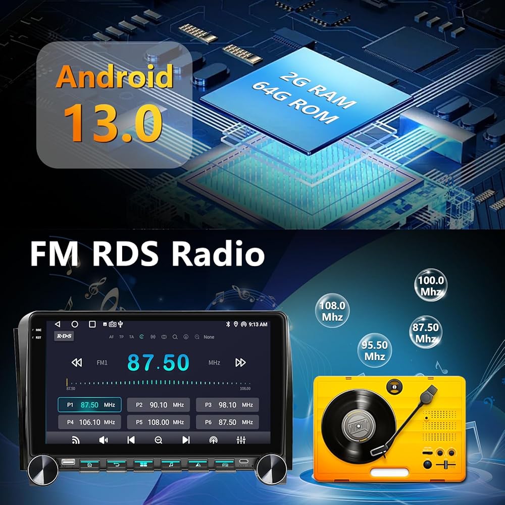 【2GB+64GB Android13 System】 This unit is equipped with the latest Android 13 system, 2G RAM, 64GB ROM, runs smoothly, support split screen