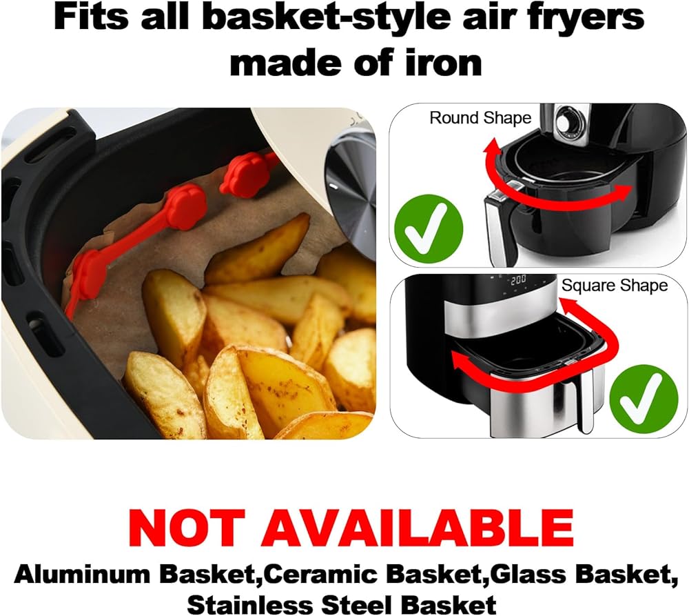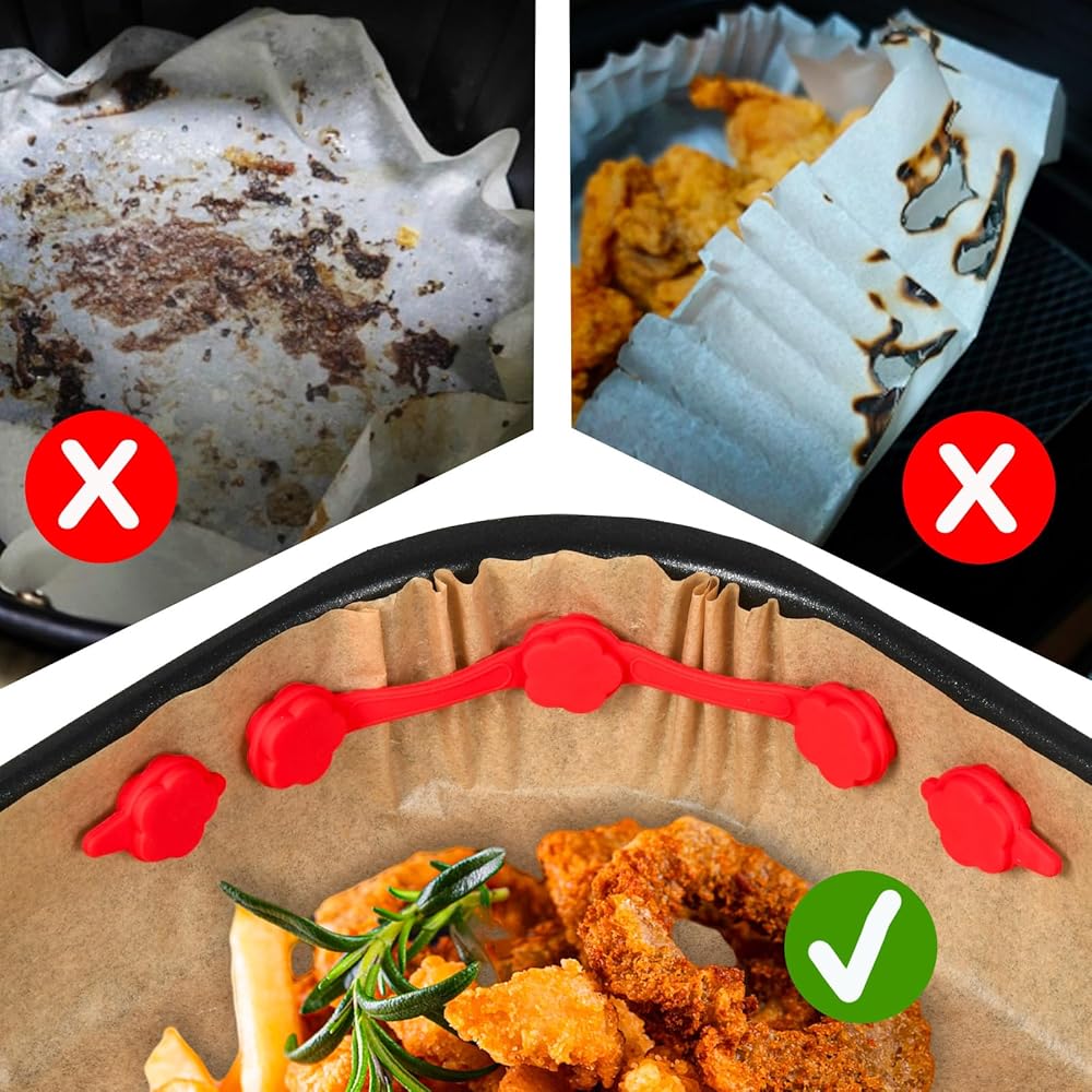 【Secure Magnets Fixation Technology – Safer, Even Cooking】 Keep your cooking safe and efficient! Our silicone air fryer magnets lock parchment liners firmly in place, preventing lifting or airflow blockage. This ensures even heat circulation and reduces fire risks by keeping liners away from heating elements. Works with most standard air fryer parchment paper sizes, making it a flexible and essential accessory for daily air frying.
