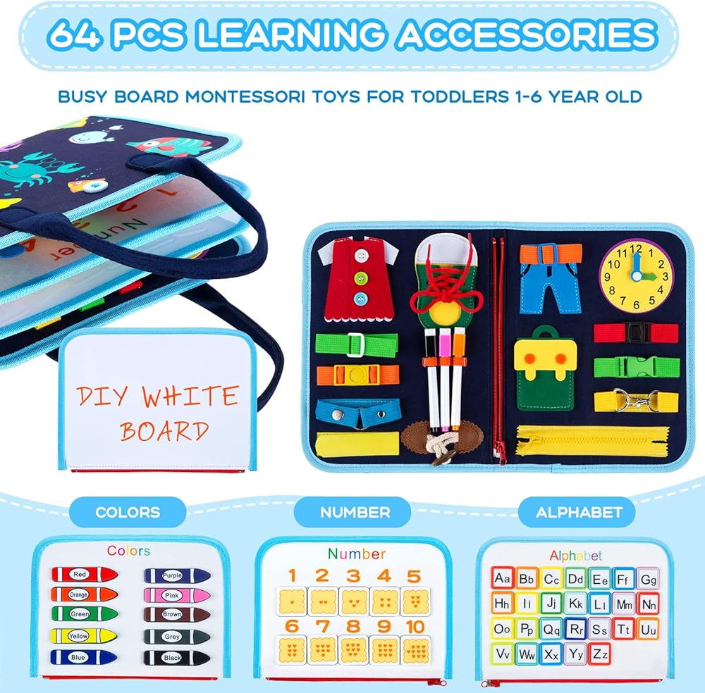 💝【6 Themes Montessori Toys for Toddler】 TESSGO busy board for 1 2 3 4 Year Old Toddler, this sensory toy can help reduce screen time while engaging kids in a variety of learning themes. The board includes six different themes: Alphabet, Numbers, Colors, Buckles, Zippers, and a Whiteboard. Additionally, the set comes with markers for whiteboard. Each page is connected by a zipper.
