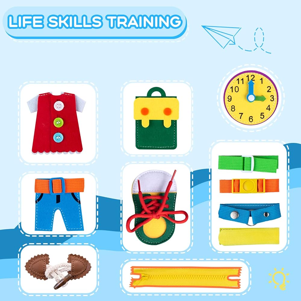 💝【Learning Toy for Life Skills】 These educational Montessori toys simulate real-life scenarios and help children learn various basic life skills. From tying shoelaces, zipping and buckling items, to buttoning and snapping, these sensory activity boards cultivate independent dressing skills, finger dexterity, fine motor skills, and cognitive abilities.