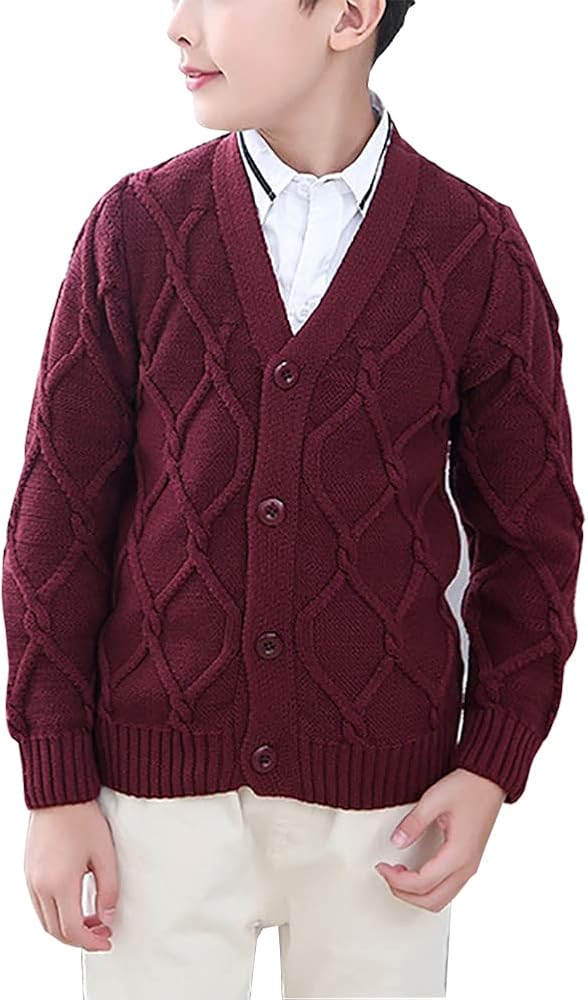 Knitted pattern, classic V Neck, button closure, cable knit boys cardigan is a must have fashion item