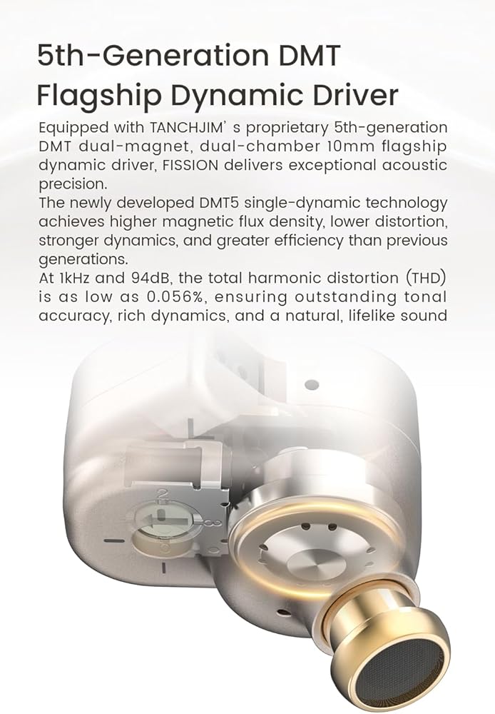TANCHJIM self-developed fifth-generation DMT dual-magnet dual-cavity flagship 10mm unit, supported by the new DMT5 single moving coil technology, so that it has a higher magnetic flux than its predecessor, lower distortion, stronger dynamics and higher efficiency; 1kHz harmonic distortion is only <0.056%@94dB, so that the FISSION has an excellent hardware foundation.