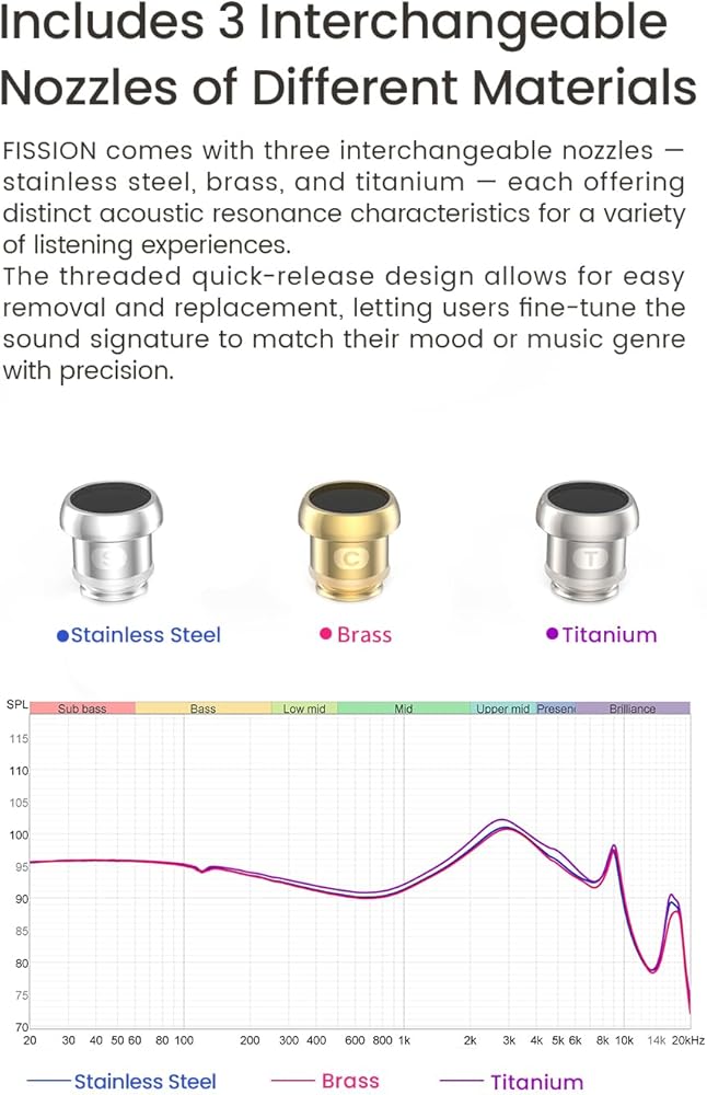 4-speed adjustable analog filter technology, through the knob adjustment, switching different analog filter gears, adjustable pop, ambience, monitoring, natural 4 modes, with 3 different materials conduit, fission 12 kinds of sound styles, through a simple collocation can be personalized FISSION, have their own listening experience.
