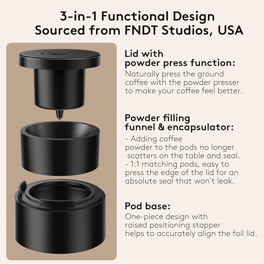 3-in-1 System: This all-in-one system includes a funnel, tamper, and sealer, Just Fill,Seal,Press and Twist! Hollow kit collect grounds easily,prevent splatter and tedious clean as others. Raised-edge holder ensures efficient and auto alignment of the aluminum foil lids. No obstruction to barcode recognition or compromise on coffee flavor. Your coffee's flavor depends on the powder you choose; try it with original vertuo pod powder for the same great taste.
