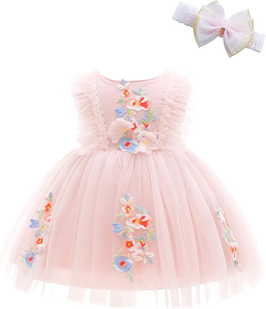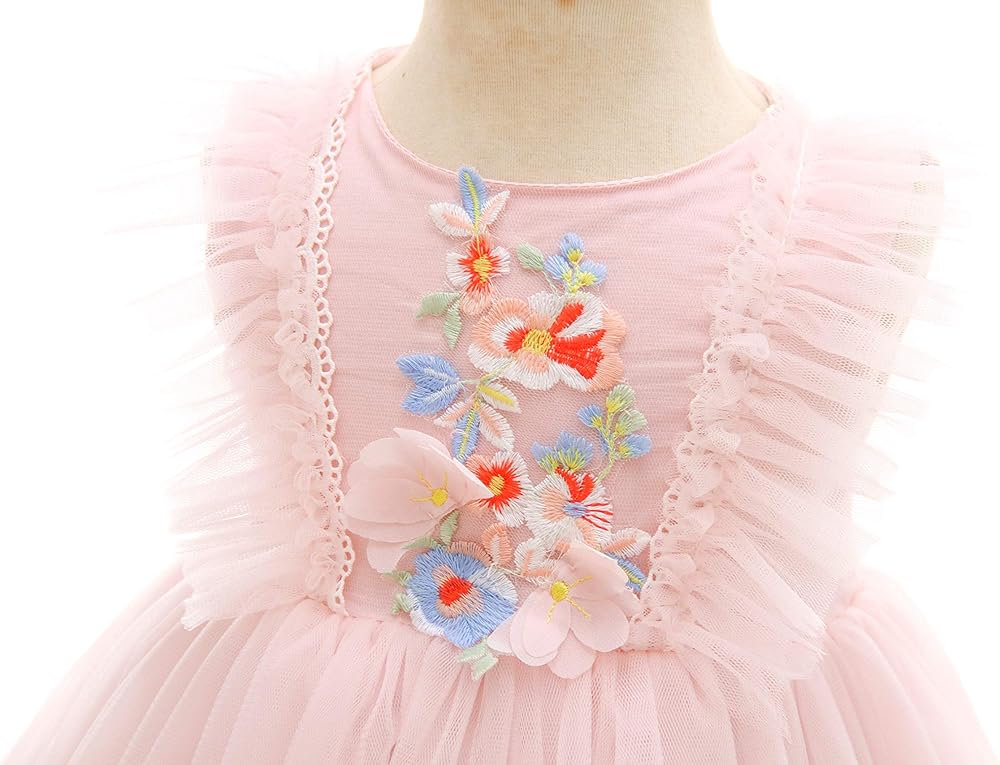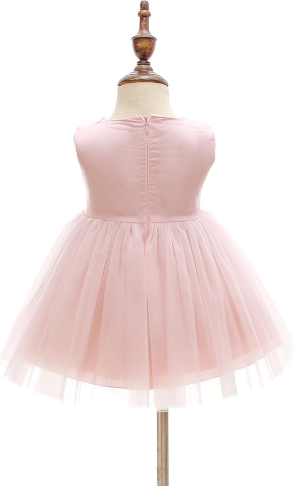 Design: Polyester, tulle, lace, cotton lining. This baby girl dress is soft and comfortable, skin friendly and breathable, fit for baby soft skin. Lace embroidery covers bodice, tulle adorns the sides of the bodice like butterfly wings, giving the dress an elegant look. HIGHLIGHTS: Sheer tulle back, made of a layer of tulle of the same color as the dress. Hidden zipper on the back, embellished with round buttons, separate wide satin belt, tied into a big bow on the back, double the cuteness.