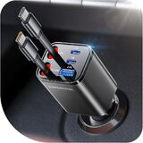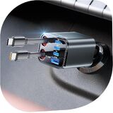 Ultra long retractable car charging cable: Our retractable car charger has two retractable cables that allow easy storage and keeping your car's interior clean and organized. No more tangled cables or cluttered carriages. The retractable line extends 0 to 31.5 inches, making it suitable for long trips, tight Spaces such as semi-truck cabins, or everyday use. You can stop it at any length, pull it again and it will automatically retract.