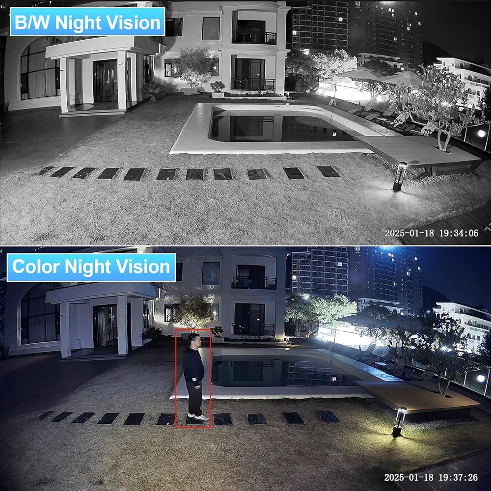 INTELLIGENT COLOR NIGHT VISION: This camera offers three night vision modes: black & white, full-color, and smart dual-light. The default factory setting is the smart dual-light mode. In this mode, the camera automatically switches from black-and-white night vision to full-color mode when detecting a person or vehicle, capturing more details. Once the person or vehicle leaves, the night vision reverts from full-color to black-and-white mode.