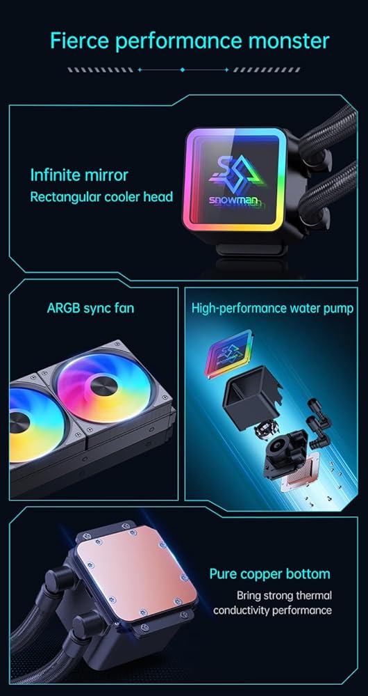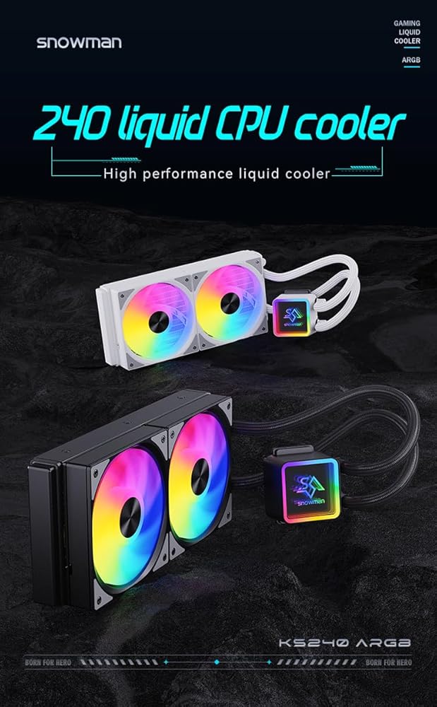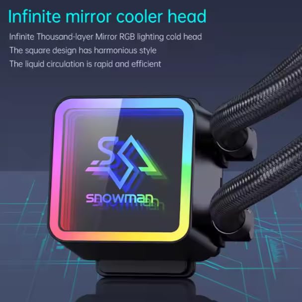 Snowman Aio Liquid CPU Cooler ABS Materials Compatible with Intel and AMD CPU vendors Efficient Control Pump Liquid Water Cooling. 240mm ARGB Black Color. Dual Fans