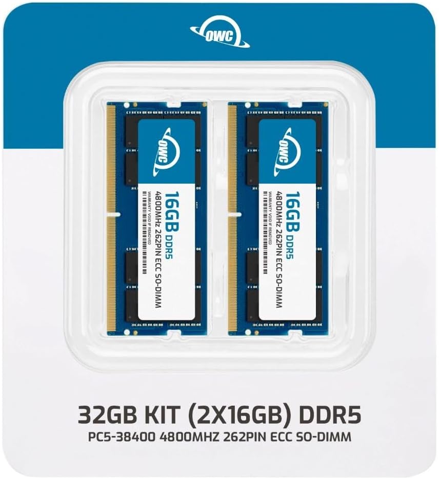OWC 64GB UPGRADE: Consists of 2pcs of 32GB DDR5 4800 PC5-38400 CL40 2Rx8 262-pin 1.1V ECC Unbuffered SODIMM Memory RAM Module Upgrade Kit for Select Laptops or All-in-One Systems.