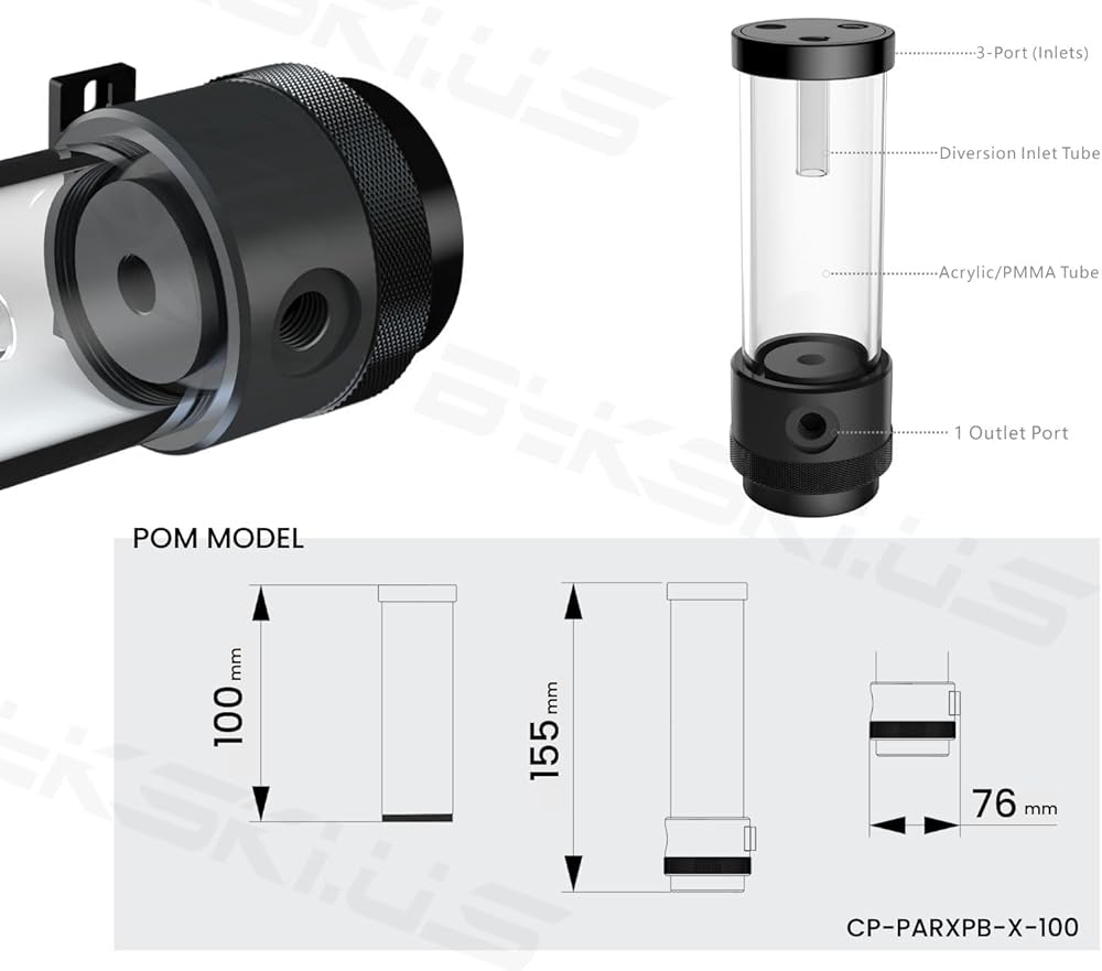 Introducing the Silent PARX Pump (330L/H) / Acrylic Reservoir Combo, a sleek and sophisticated solution tailored for compact to mid-sized PC water-cooling setups. Designed with both style and functionality in mind, this pump offers impressive water circulation capabilities, boasting an exceptional flow head of 3 meters.Operating smoothly and silently, the pump's RPM range spans from 1800 to 3000, ensuring a serene computing experience. Its core, the CP-PARXPB-X pump core, features a robust ceramic shaft, granting it an astonishing lifespan of up to 50,000 hours. With this remarkable longevity, users can enjoy years of uninterrupted performance and find solace in knowing that their system will remain efficient and reliable.FeaturesSuperior 12 Volts DC convenience: plugs into the computer power supplyLow maintenance, Low NoiseSpecificationsPower: DC12v / 1.5Voltage: 12vPower Connector: 4-Pin MolexSpeed Control/Data: 4-Pin PWMMax RPM: 1800-3000RPMMaximum discharge: ~ 330L/HTop Material: PMMA/POMThread: G1/4Stand Color: BlackTube Circumference (All Models): 60mmDimensions: PMMA100mm Model - 83mm x 164mm150mm Model - 83mm x 214mm200mm Model - 83mm x 264mmDimensions: POM100mm Model - 76mm x 155mm150mm Model - 76mm x 205mm200mm Model - 76mm x 255mmCompatibilityLoop: Non-AluminumIncluded Parts1x PARX Pump (installed)1x Tube Reservoir + Top1x Pump Armor (installed)2x Mount Brackets + ScrewsPMMA Models include 1x 5v Addressable RGB (RBW)Warnings(Warning: Addressable RGB (RBW) is 5V and is ONLY compatible with A-RGB (RBW) components. RGB is 12V and is ONLY compatible with RGB components. Mix and match will NOT work and will cause damage.Using caustic and/or abrasive coolant will void your warranty (see warranty section) and may cause your pump to fail.Do not run the pump dry. The PC water-cooling pumps are designed as self-lubricating. This means the pump's fluid is designed to push/create flow and is also used to lubricate the internal pump parts. This design means you should