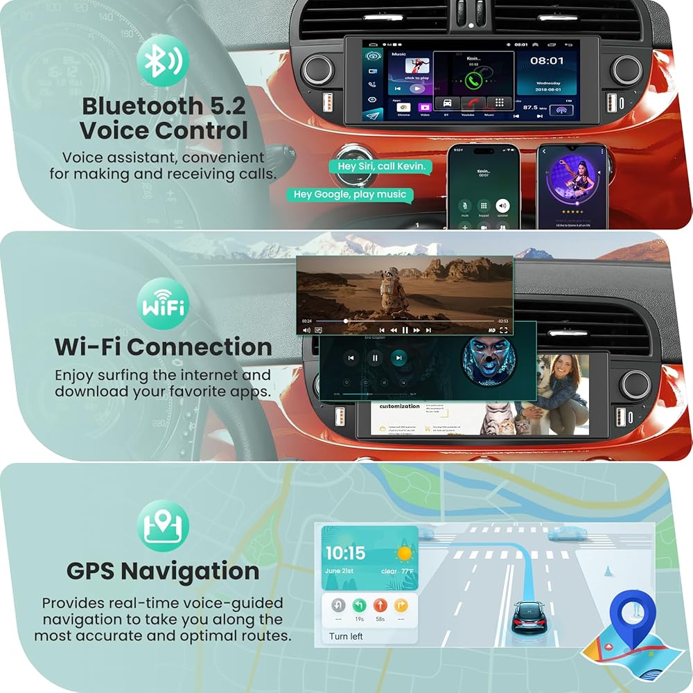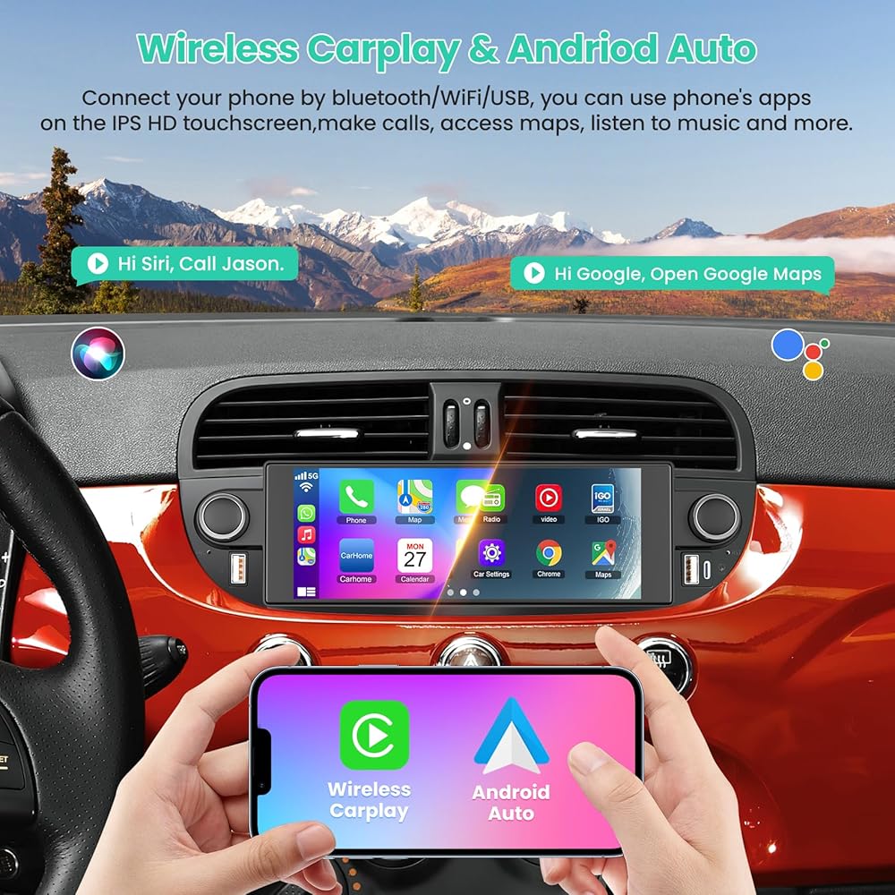 【Wireless CarPlay & Android Auto】The high performance Fiat car radio is compatible with IOS CarPlay and Android Auto. Connecting to your smartphone , this Fiat car stereo supports the following functions : music, map, phone, videos and more. Through this Fiat radio, you can get your direction from GPS navigation apps ,such as Google- map, Waze, and make calls by calling your smart voice assistant ,freeing your hands to focus on safe driving.
