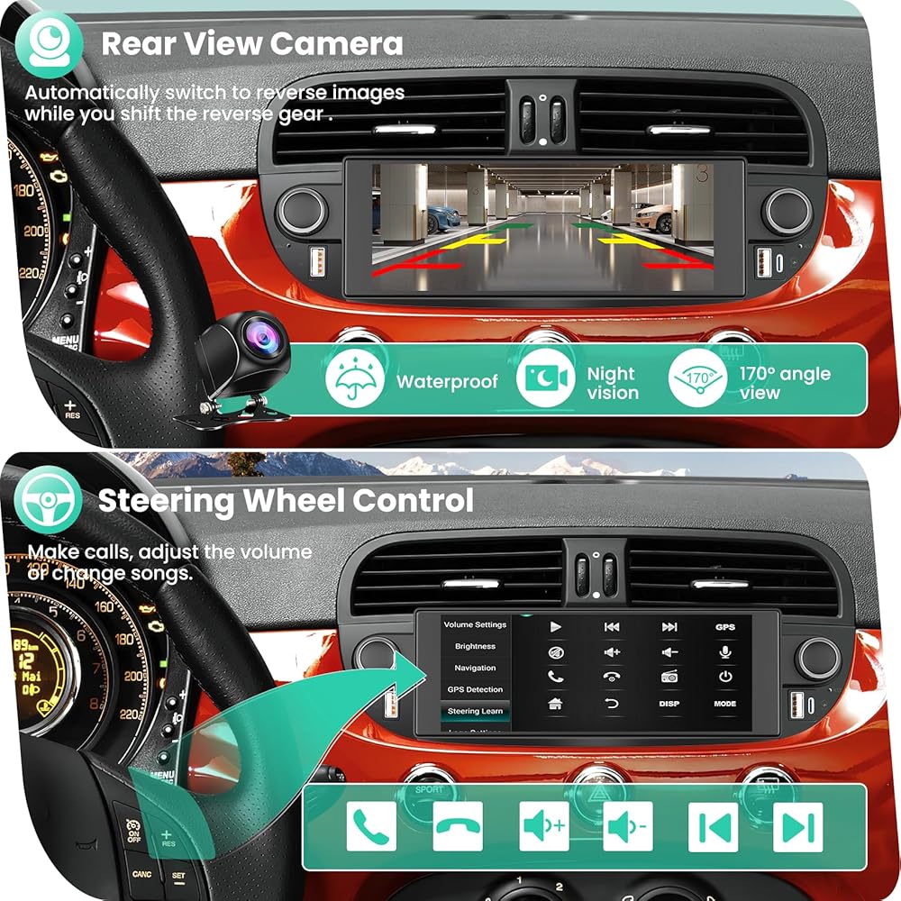 【Steering Wheel Control and Backup Camera】Retain familiar controls for safe driving with the 2009 Fiat radio's SWC interfaces. Customize controls over stereo to suit your preferences. Additionally, the backup camera features night vision, waterproofing, and a wide 170° field of view, providing more visibility behind you compared to just using your mirror. The image is automatically displayed on the screen, making your stereo a valuable safety tool when reversing.