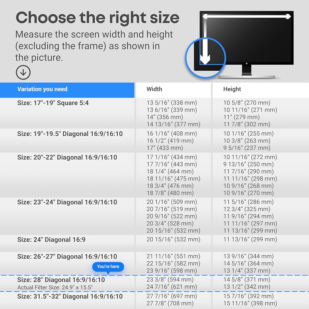 • Vintez anti blue light screen protector is universally compatible with 28 Inch 16:9 monitors with actual filter sizes: W 24.9" X H 15.5" and 15.6 Inch 16:9 monitors with actual filter sizes: W 14.2" X H 8.7". This versatile blue light protector for computer monitors is engineered to be ideally compatible with HP, Samsung, Dell, Lenovo, Acer, ASUS, LG, ViewSonic, Huawei, MSI, and other monitor brands.