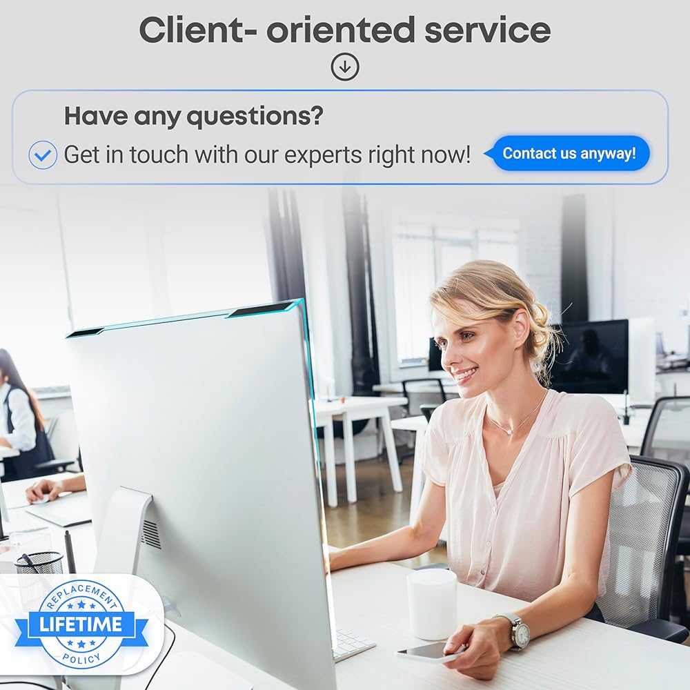• The blue light screen protector mounts easily in seconds without tools or hardware. Peel the matte protective film away from both sides of the blue light screen protector. Then position the turned edge over the monitor top. Lifetime Replacement Guarantee – Your blue light screen is protected under our lifetime replacement guarantee, and if anything happens we will send you a new screen at absolutely no cost.