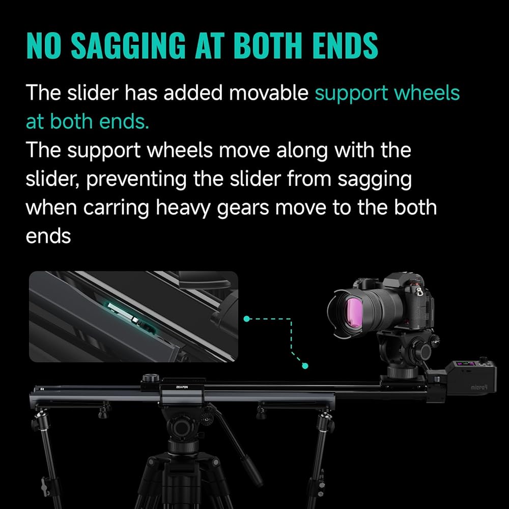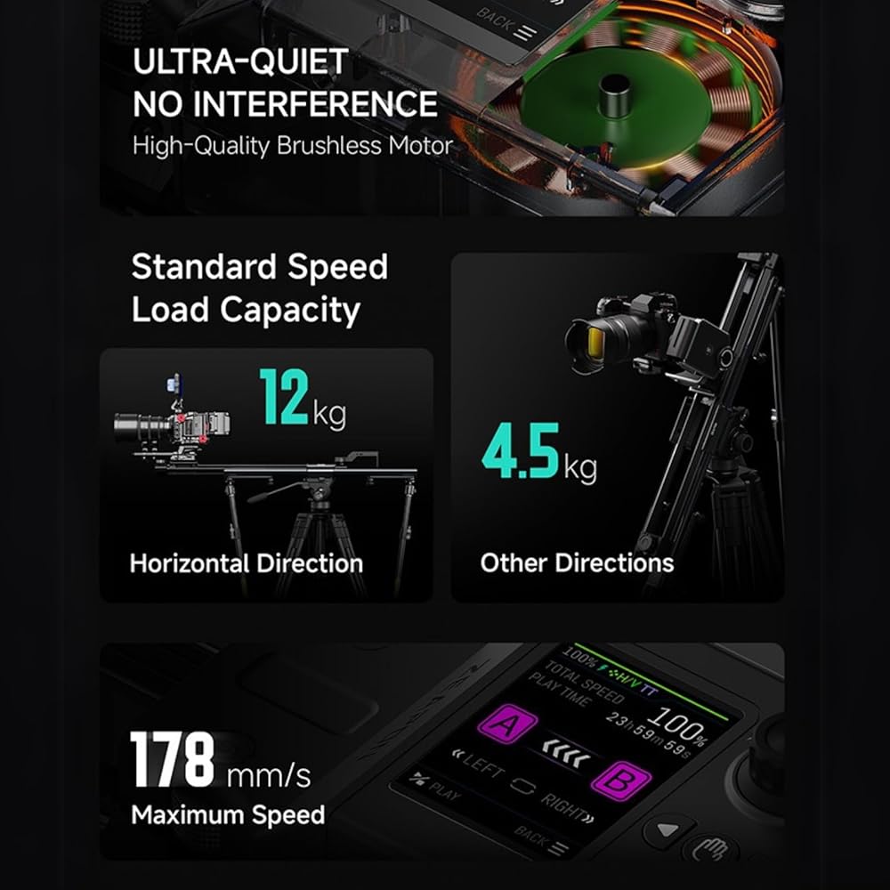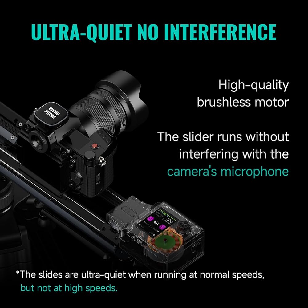 Ultra-quiet: thanks to the powerful brushless motor, the slider runs without noise in camera's microphone, with Micro4, we are free to record everything. (The slides are ultra-quiet when running at normal speeds, but not at high speeds.)