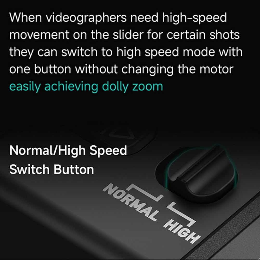 High speed mode: When videographers need high speed movement on the slider for certain shots, can switch to high speed mode with one button without changing the motor, easier in dolly zoom.(recommend maximum payload 2.5kg in high speed mode)