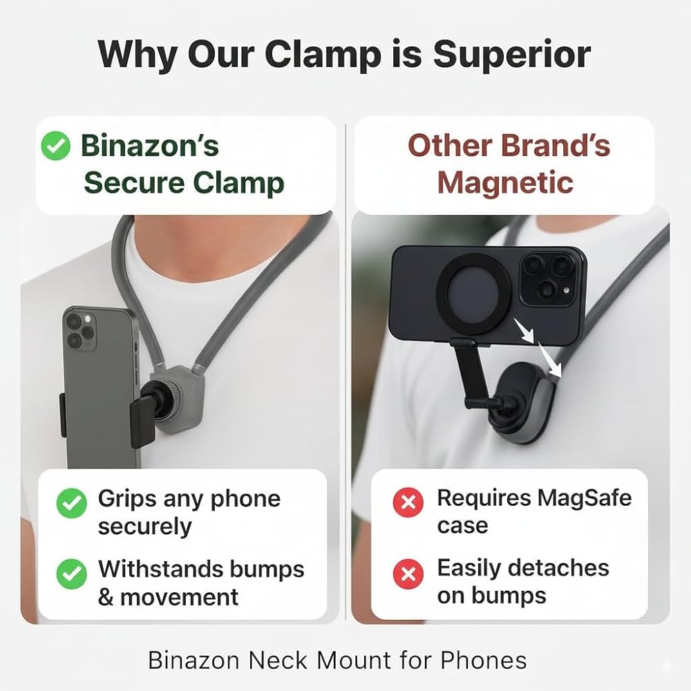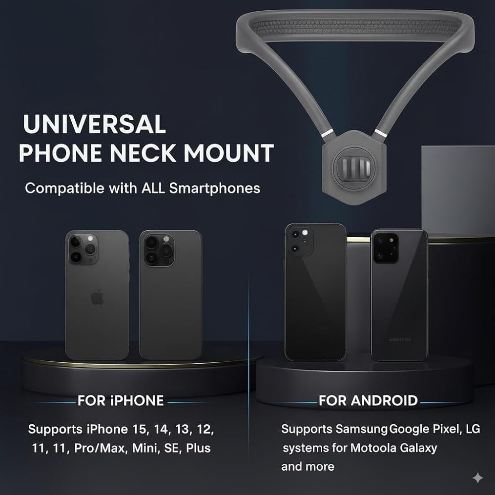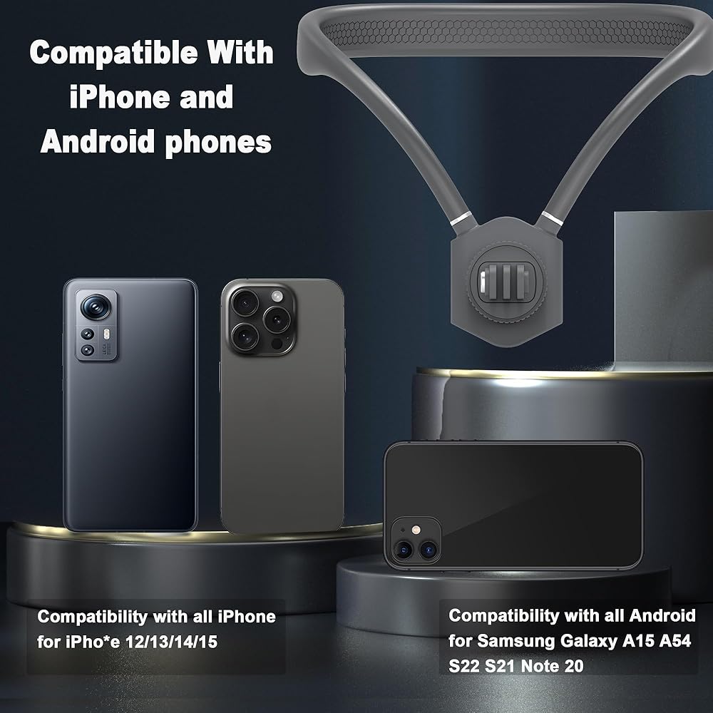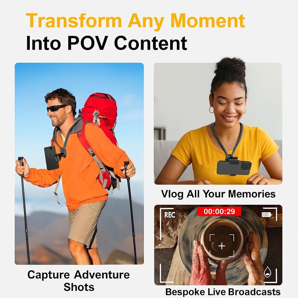 【Multiple POV/VLOG angles adjustable】One person can shoot videos. The necklace-style mobile phone holder enables the mobile phone to switch between portrait and landscape shooting modes at will, and meets the multi-functional shooting modes of short video content creators: landscape, portrait, overhead, and low angle.