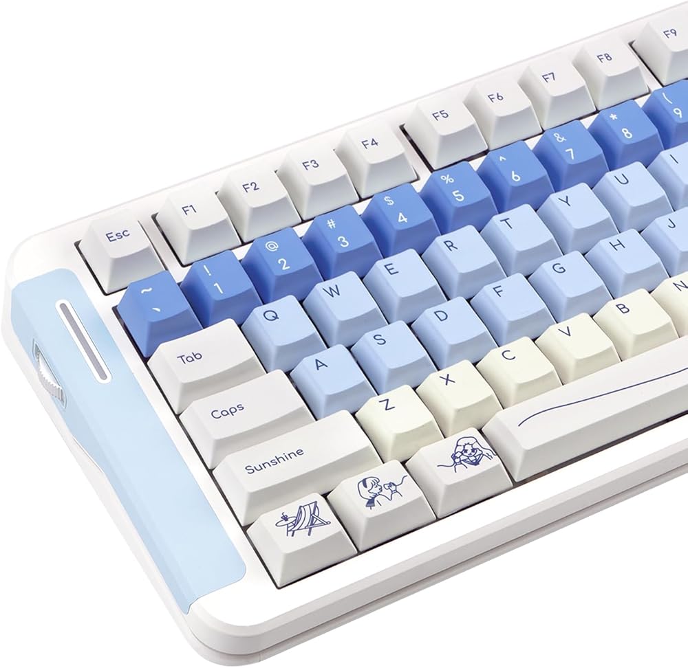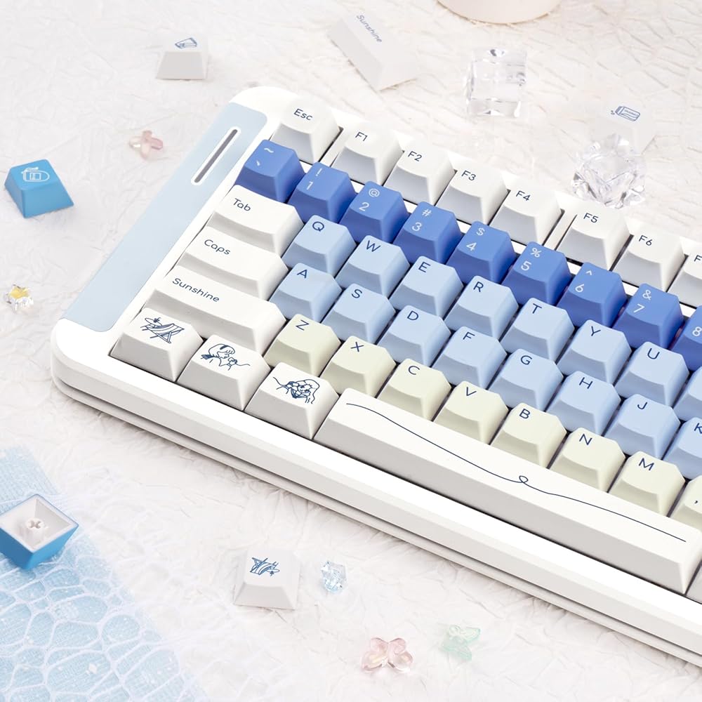 PBT Dye Sub: These are Dye Sub keycaps made from thick PBT material, about 1.7mm thick, durable and brightly coloured, with beautiful patterns that won't fade with prolonged use.