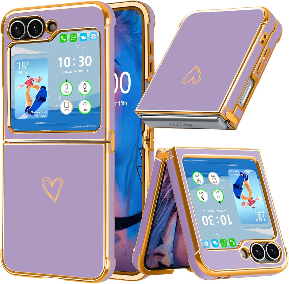 Designed for Samsung Galaxy Z Flip 6/5 Case, Women Girls Gold Plating Heart Fashion Flexible Slim Full Protective Phone Cases Cover for Z Flip 6/5 (Purple)
