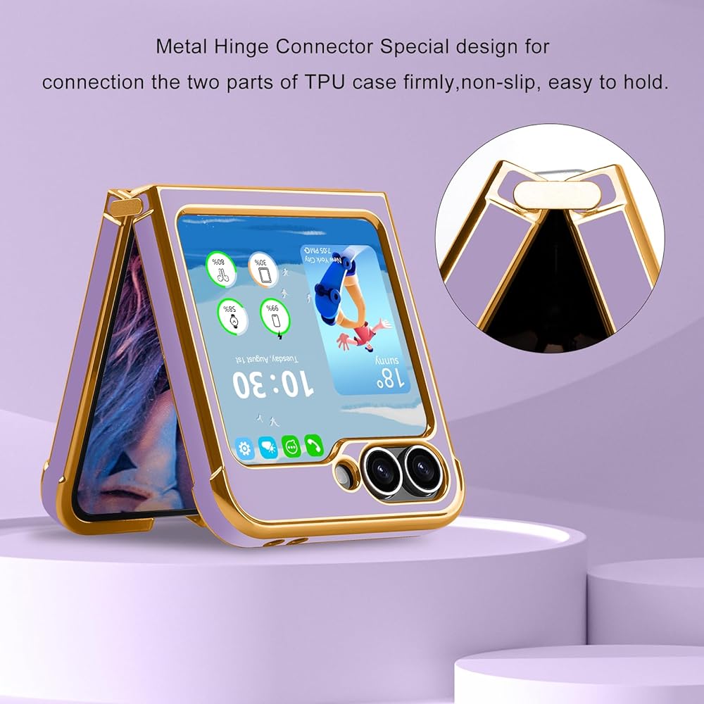 【Full Protection】: Raised bezel edges prevent your galaxy z flip 6/5 camera and screen from getting scratched or smudged on flat surfaces. The flip 6/5 case with metal connecting piece to solve the problem of non-slip, four corners can absorb the shock well when drop accidentally.