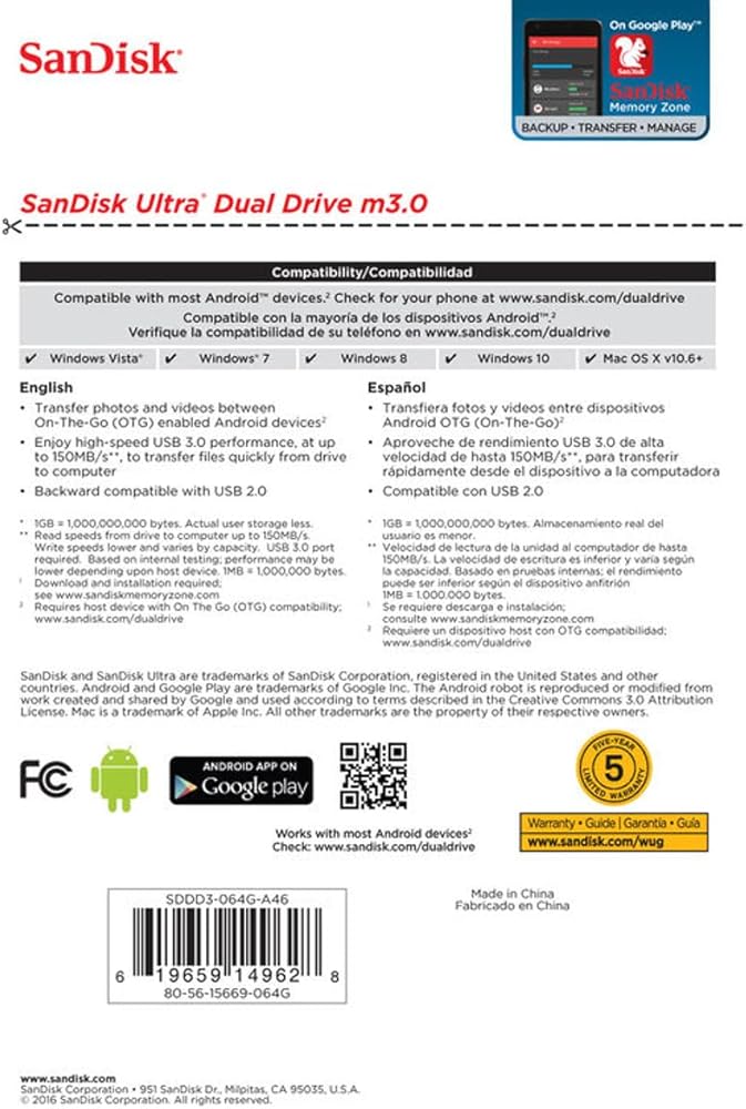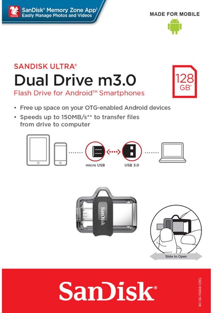 What sets the 128GB Ultra Dual m3.0 USB 3.0 and Micro USB Flash Drive apart is its ability to effortlessly streamline your digital life. This high-capacity, versatile flash drive is designed to instantly free up space on your Android smartphone, making it a breeze to transfer content from your phone to your computer. Equipped with a micro-USB connector on one end and a USB 3.0 connector on the other, this dual drive facilitates easy movement of content between your devices. Whether you're transferring data from your Android smartphone or tablet to your laptop, PC, or Mac computer, this flash drive ensures a seamless process. The USB 3.0 connector is not only high-performance but also backward-compatible with USB 2.0 ports, offering you the flexibility to work with a range of devices. With a read speed of up to 150MB/s, this flash drive enables super-fast file transfers, significantly faster than a standard USB 2.0 drive. The 128GB Ultra Dual m3.0 USB 3.0 and Micro USB Flash Drive is compatible with OTG-enabled Android devices, further expanding its usability. With this flash drive, you can quickly free up space on your Android smartphone or tablet, enabling you to capture more photos and videos. The sleek, retractable design of this flash drive offers both micro-USB and USB 3.0 connectors, making it a compact and practical solution for your storage needs. The SanDisk Memory Zone app, available on Google Play, simplifies file management, allowin