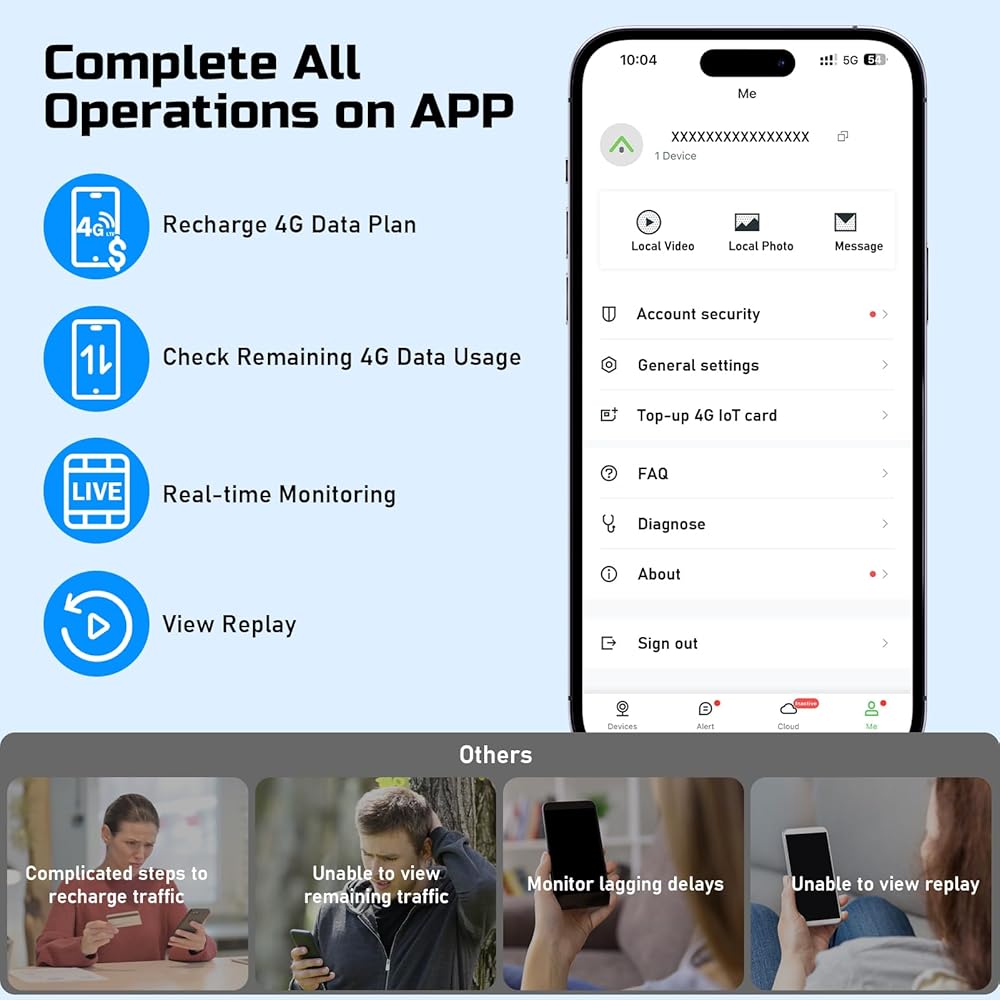 【2-Minute Fast Binding & APP Management】Our 4G camera requires no complicated settings, just scan the code to connect, reducing the steps by 50% and saying goodbye to cumbersome procedures. Meanwhile, the APP offers intelligent control, whether it is remote viewing monitoring, adjusting picture quality, checking data usage or renewing data packages, all can be done with just one click, making it extremely convenient and fast. (The manual comes with graphic instructions, allowing even beginners to complete the process easily)