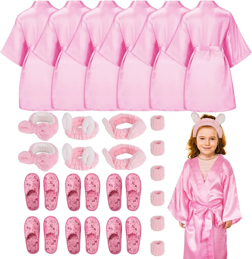 Bulk Slumber Party Supplies for Girls - You will receive a sweet pink girls spa set: 6 PCS satin girls robes, 6 PCS hairbands, 6 PCS wristbands and 6 Pairs of slippers, 24Pcs sleepover stuff is enough for your spa party.