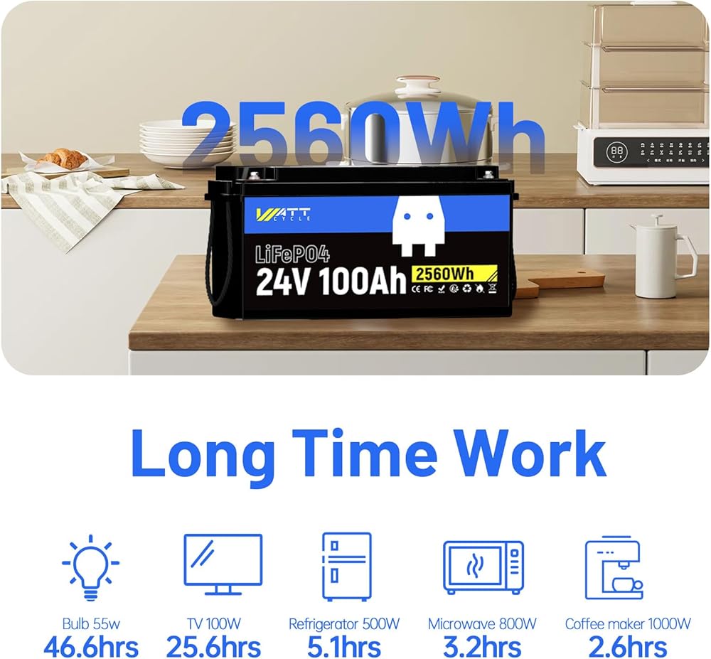 🔋 【Powerful Power Support】: 24V 100Ah LiFePO4 Provide long-lasting and reliable power support to meet your high-energy demands. The 24V 100Ah lithium iron phosphate battery offers a larger capacity, delivering extended runtime for your devices and systems.Suitable for various applications such as solar systems, RVs, boats, electric vehicles, and more.