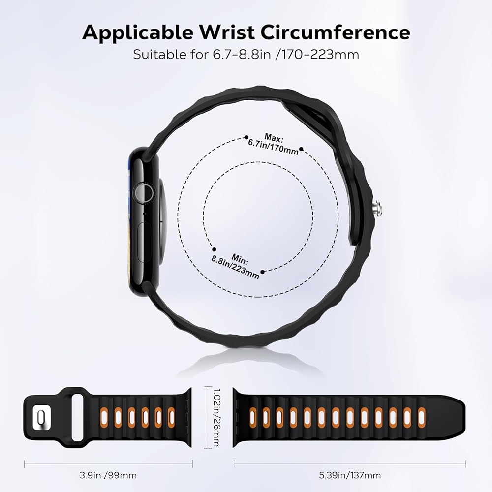 • Compatible Models: The silicone Ocean watch band is compatible with Apple Watch Ultra 2, Ultra1, Apple Watch series 10, series 9, series 8, series 7, series 6, series 5, series 4, series 3, series 2, series 1, Apple Watch SE. Our iWatch bands is designed for 46(Series 10)/49/45/44/42mm(Series 3-1). Suitable for 6.5"-8.07"(165mm-205mm) wrist. (Note: Smartwatches not included)