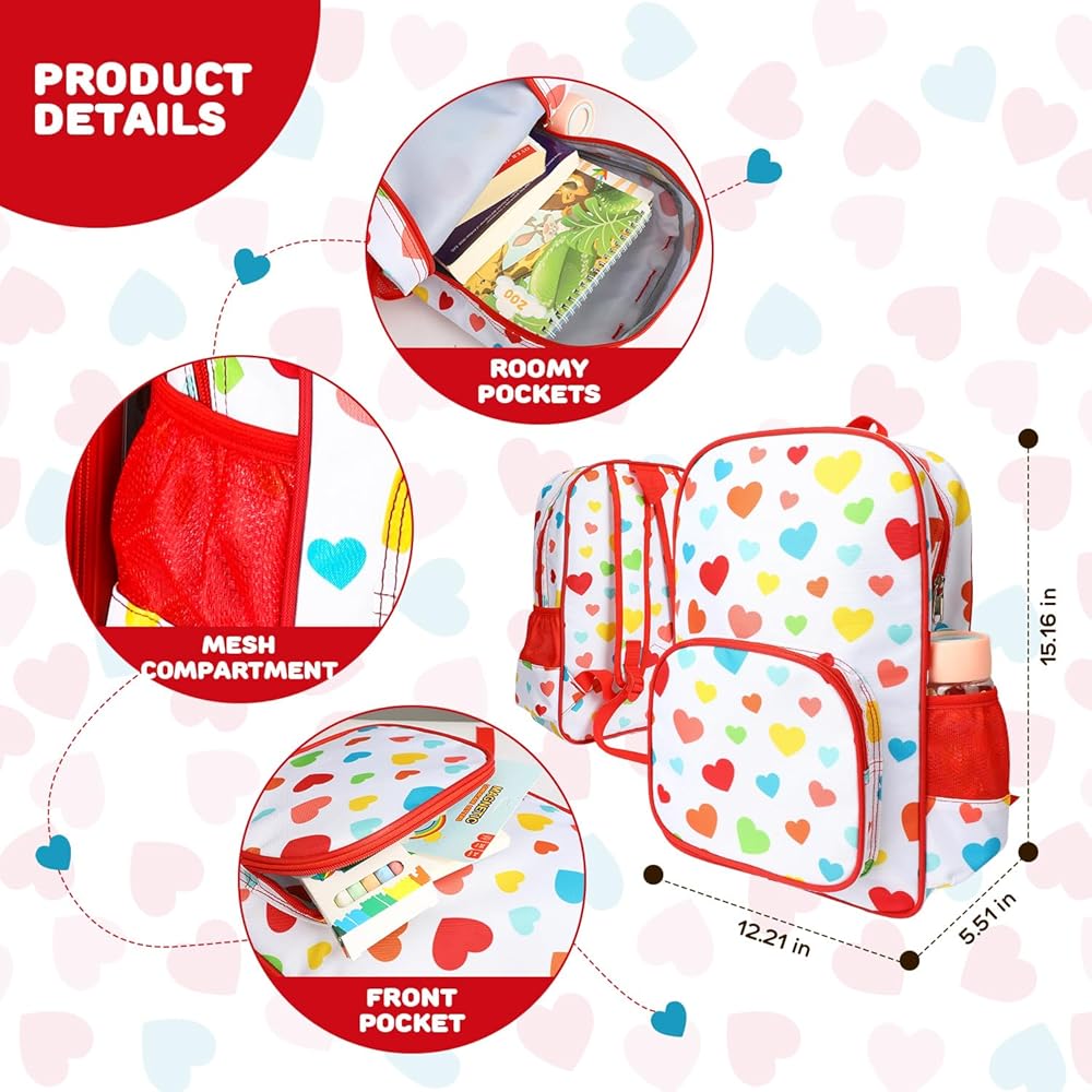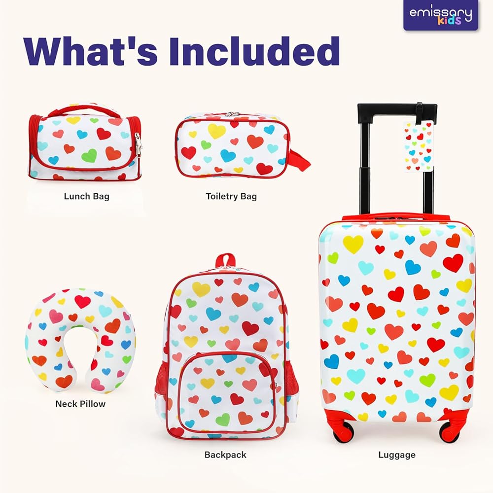 Travel in Chic Fashion with this Charming Luggage Set, showcasing a vibrant heart-shaped design that captures attention. Ideal for kids aged 3-7 years old, this set encompasses an 16” rolling luggage piece equipped with a telescoping handle and 360-degree spin wheels. Additionally, it includes a 14” backpack for accommodating extras, a toiletry bag for meticulous organization of personal items, a Lunch Box for snacks on the go, and a Neck Pillow for added comfort. These pieces are perfectly sized for both airline travel and road trips to visit loved ones. Crafted from highly resilient, waterproof material and featuring a secure locking zipper, your belongings remain safeguarded. Embark on your journeys with joy!