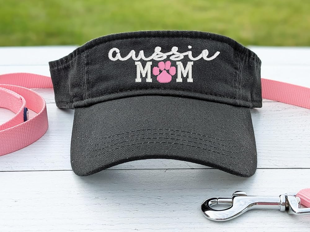 Women's Aussie Dog Mom or Mama Black Visor, Cute Embroidered Australian Shepherd Sewn Paw Print Clothing Gift Present, Sun Hat Owner Wife Friend Sister Birthday Dog Park Paw Print, Custom Personalized