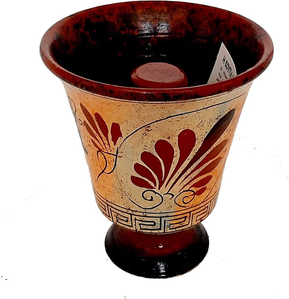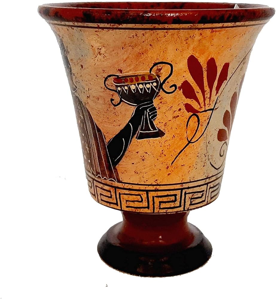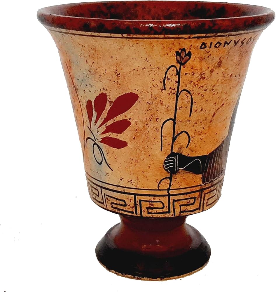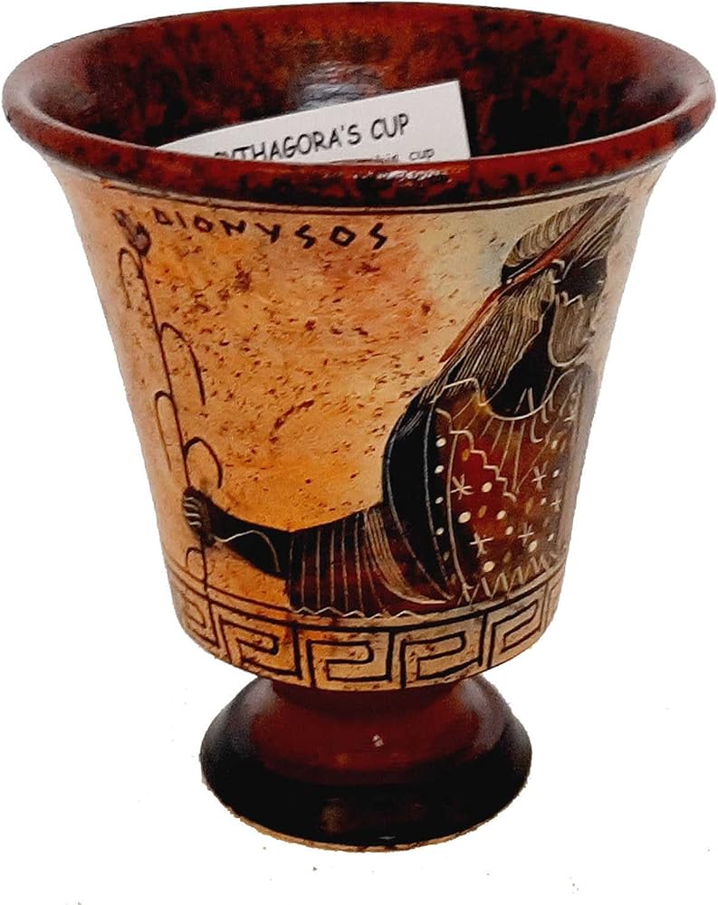 Buy a Pythagorean Cup with colors deteriorated like staying on the bottom of the sea for many centuries ,Showing God Dionysus .InAncient Greek Mythology God Dionysus was the God of wine, fruitfulness, parties, festivals, madness, chaos, drunkenness, vegetation, ecstasy, and the theater. A Pythagorean cup (also known as a Pythagoras cup, a Greedy Cup or a Tantalus cup) is a form of drinking cup which forces its user to imbibe only in moderation. Credited to Pythagoras cup, it allows the user to fill the cup with wine up to a certain level. If the user fills the cup only to that level, the imbiber may enjoy a drink in peace. If the imbiber exhibits gluttony, however, the cup spills its entire contents out the bottom (onto the lap of the immodest drinker).