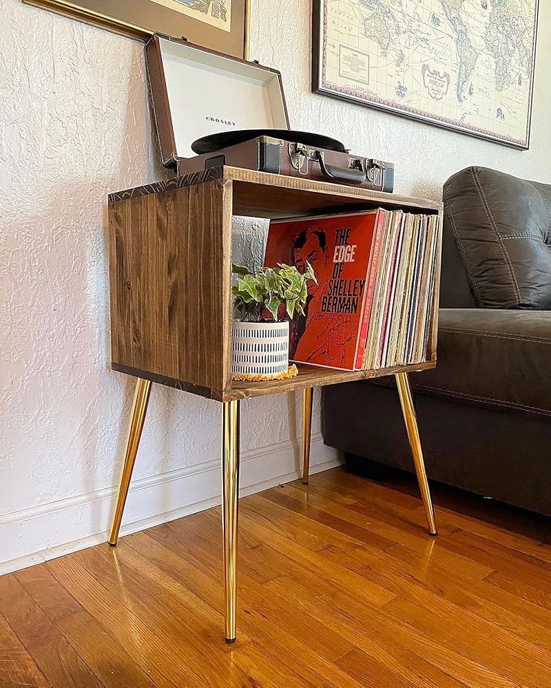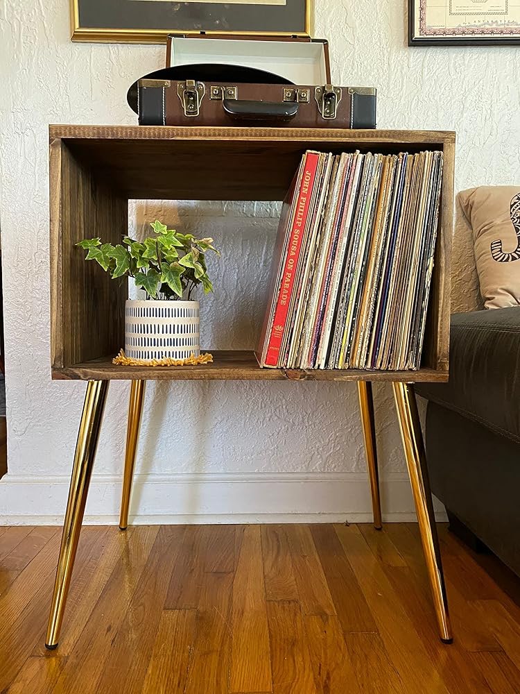 -Solid wood -Metal Golden Legs -Handmade -Storage for up to 250 Records -You will receive this item already assembled! All you will have to do is screw the legs in and that's it!