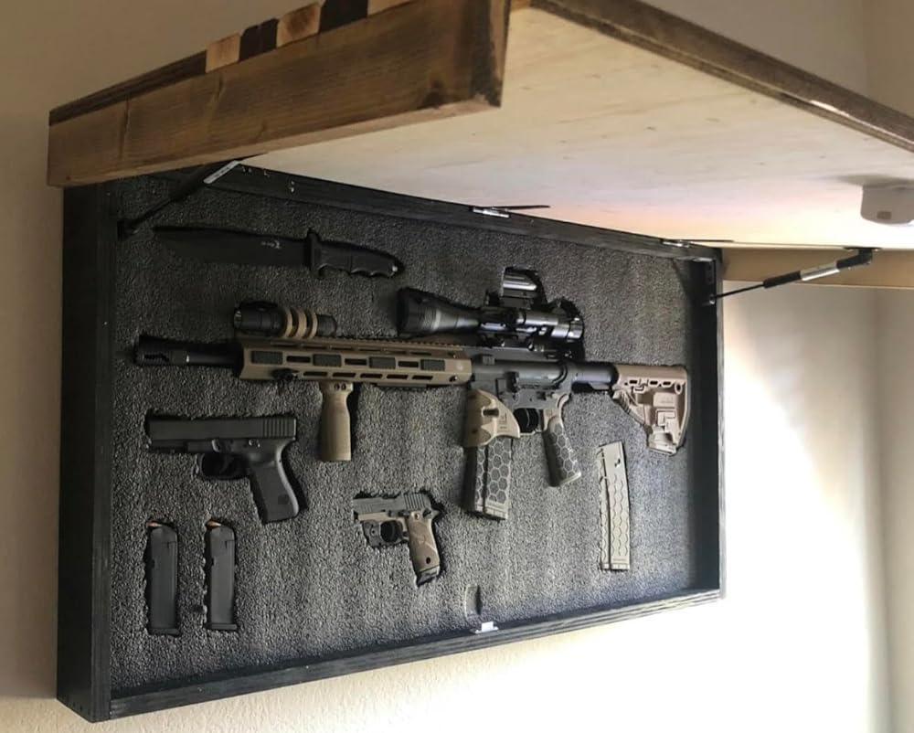 The U.S. Constitution bestows on each American the right to bear arms, and now you can conceal your firearms and other accessories with a piece of art depicting the beautiful Stars and Stripes. Crafted Spruce that allows for a truly unique one-of-a-kind look. Each unit is shipped with mounting hardware. Outside Dimensions are 43.5 "x22" Inside Dimensions are 39'x20"x3.25" Slide Up comes with a Biometric Lock (holds up to 10 fingerprints). There is a simple button to release the door to be assisted down in its resting position.
