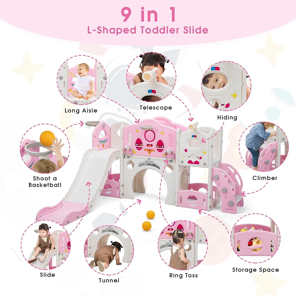 9 in 1 Toddler Slide and Climber Playset Freestanding Backyard Playground for Children Age 1-4, Indoor Outdoor Kids Slide with Basketball Hoop,Telescope, Ring-toss and Storage Space
