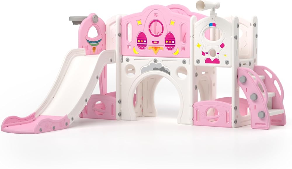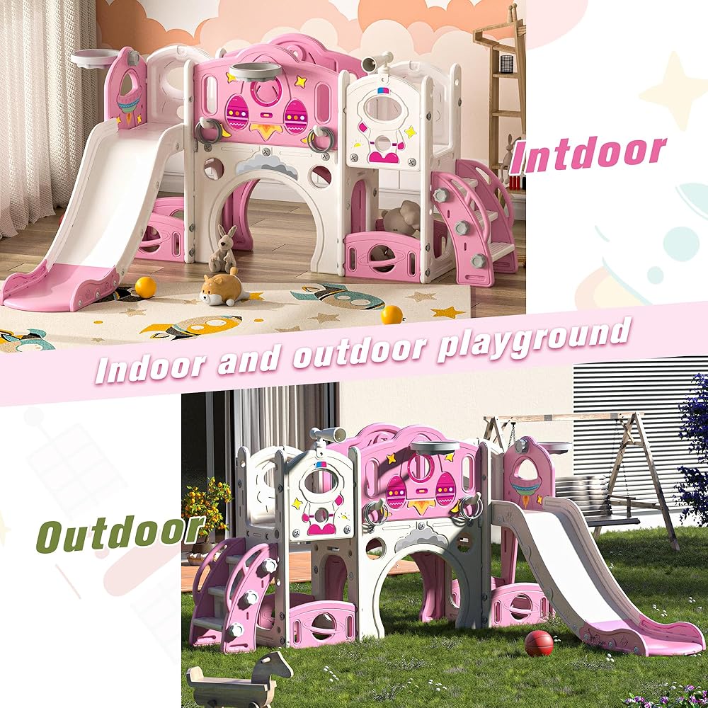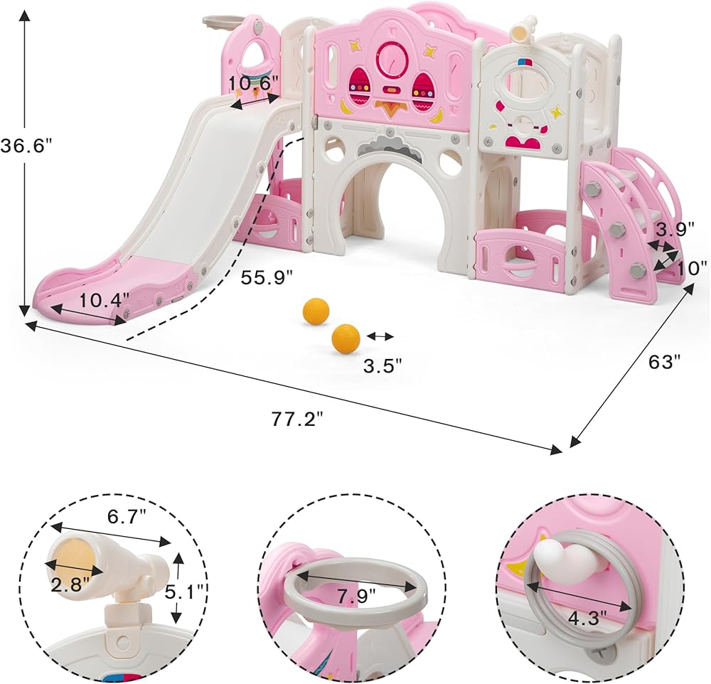 【Infinite Fun Center】: This climber slide transcends the ordinary, transforming into a vibrant playground that contains slide, basketball hoop, telescope, engaging ring-toss and climbing elements. This innovative design invites kids to discover a personalized avenue of enjoyment