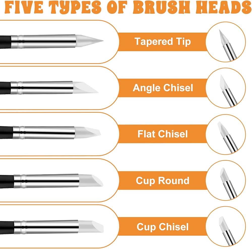 【Diverse Shapes and Sizes】This set features 5 edge shapes, including cup chisel, tapered tip, flat chisel, cup round head, and angled chisel. The clay sculpting tools cater to both fine and extensive painting and carving needs, making the silicone paint brush suitable for various arts and materials